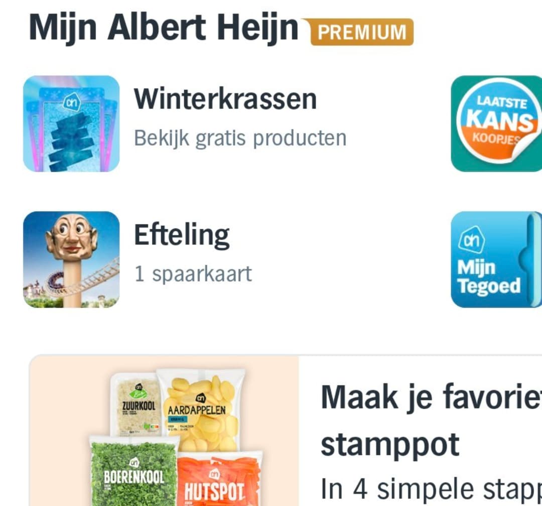 Ik zie helemaal geen kraskaarten in mijn AH app terwijl ik maandag voor 40 euro boodschappen heb gedaan? Ik heb premium en Efteling etc. spaar ik wel automatisch maar kraskaarten staan er niet tussen?
