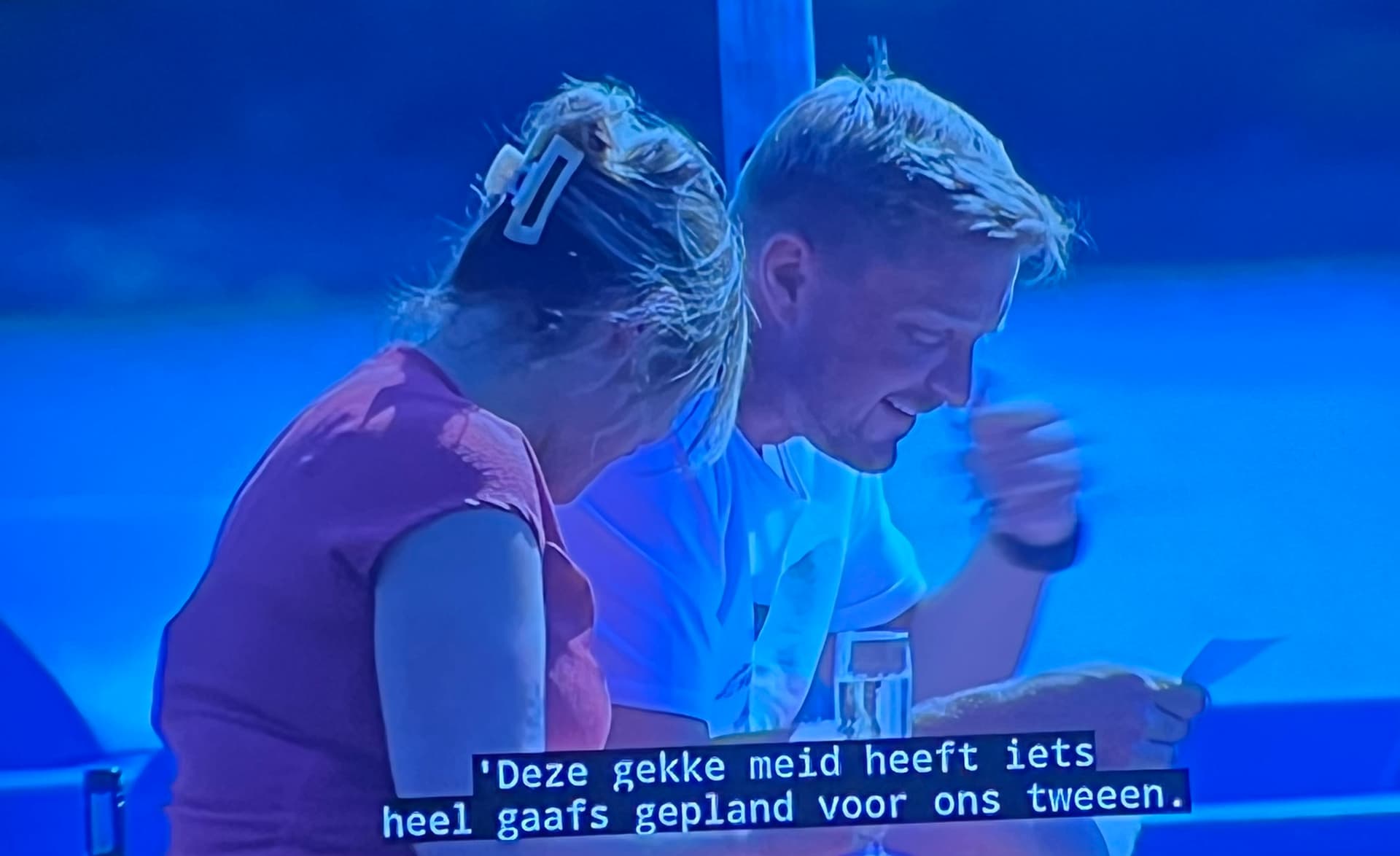 Sowieso was ze aan het inpakken toen JP binnenkwam, tas stond al op het bed. Dan komt het verhaal van de Kees-klik maar hij verpakt dat als vanuit hem geen romantische klik. Hij is het moment ontzettend aan het regisseren, begint meteen een heel verhaal over hoe leuk het is als ze met Kees is, hoe prima dat is, hoe ze altijd vrienden blijven. Dan brengt ie het aan de andere vrouwen als dit: