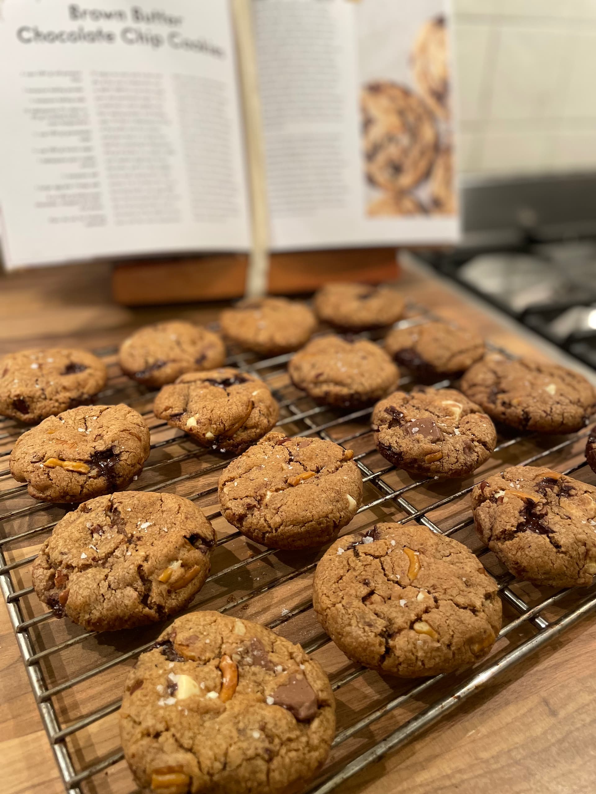 Morgen als afscheid op m’n werk een grote batch triple-chocolate-chip met gebruinde boter, pecannoten en pretzels gemaakt