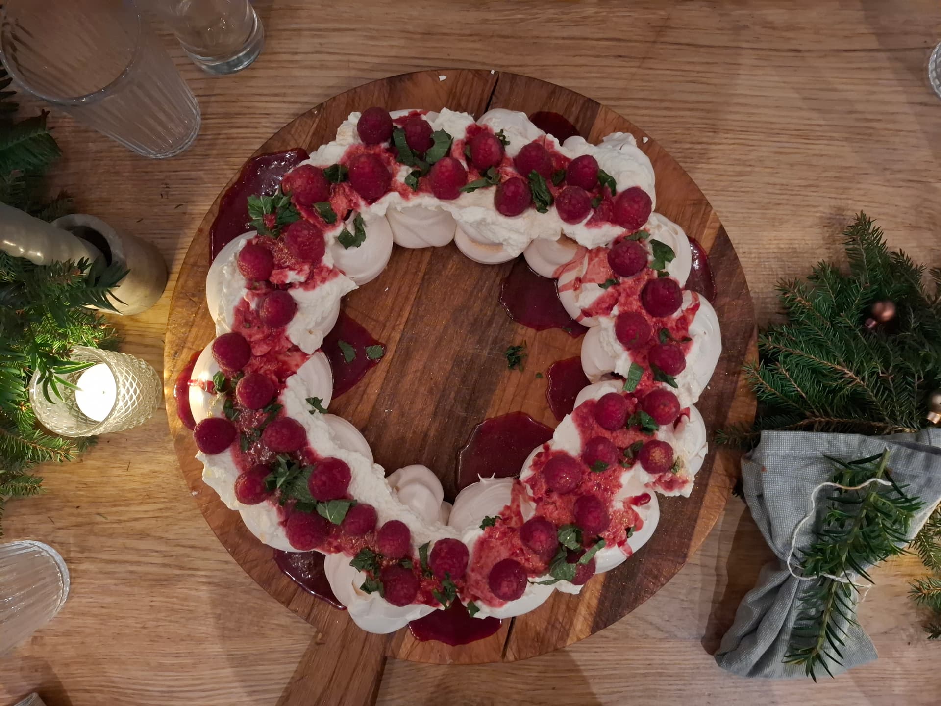 Ik had een pavlova gemaakt voor het desert. Blijft toch een zeer goede ‘moeite vs resultaat’ verhouding wat mij betreft. Het was heerlijk. Had er slagroom, frambozencoulis, verse frambozen en wat goudspray bij gedaan. Slagroom ziet er te ver uit maar hij was nog net goed.