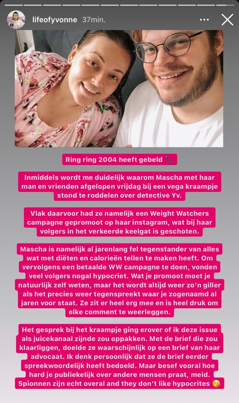 Ik vraag me trouwens af of dat hele ding echt is. Of door die kritiek die Mascha op WW kreeg dat Yvonne haar ook in t kwade daglicht wilt zetten. Vind t veel te toevallig zo dicht achter elkaar