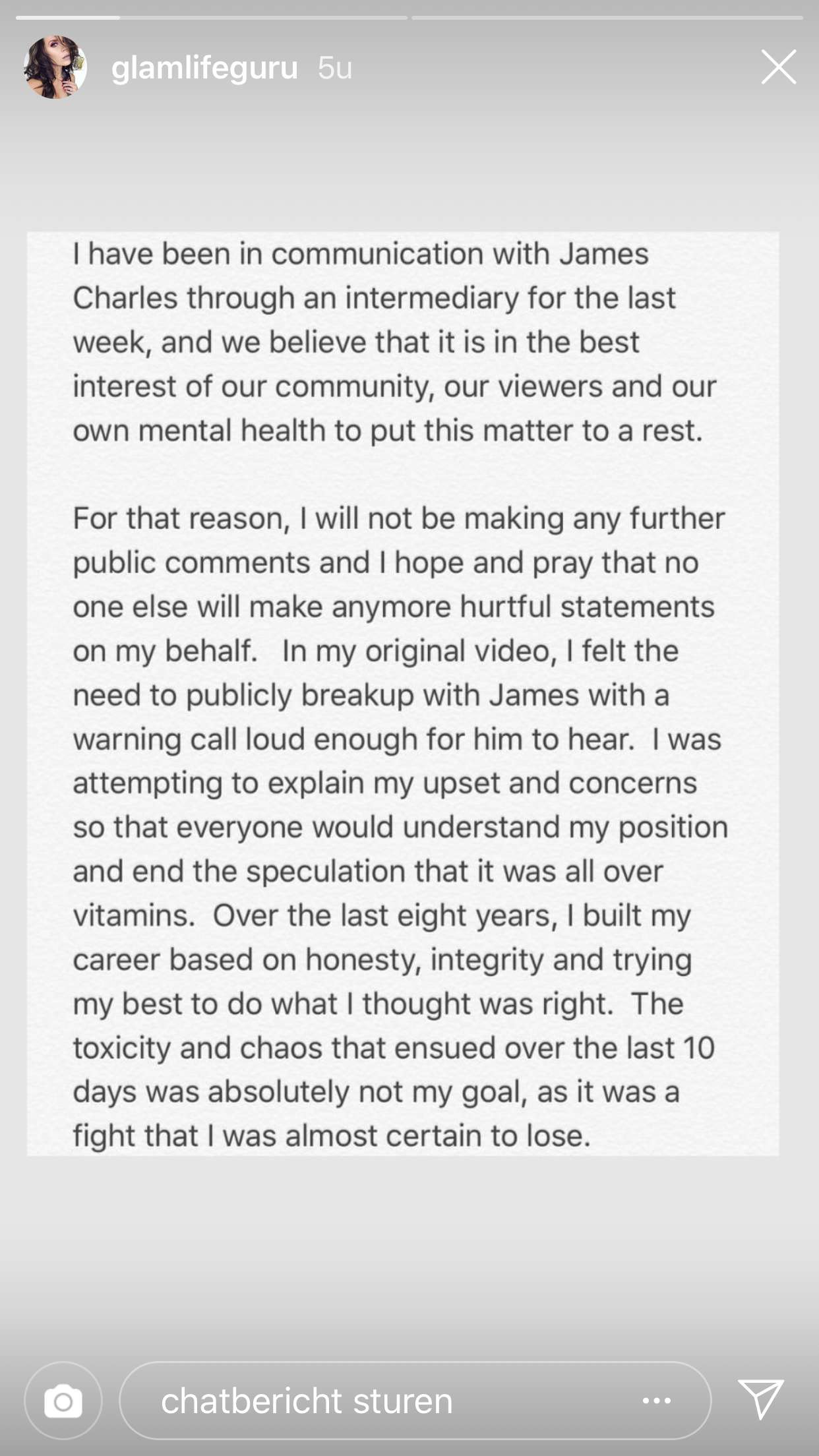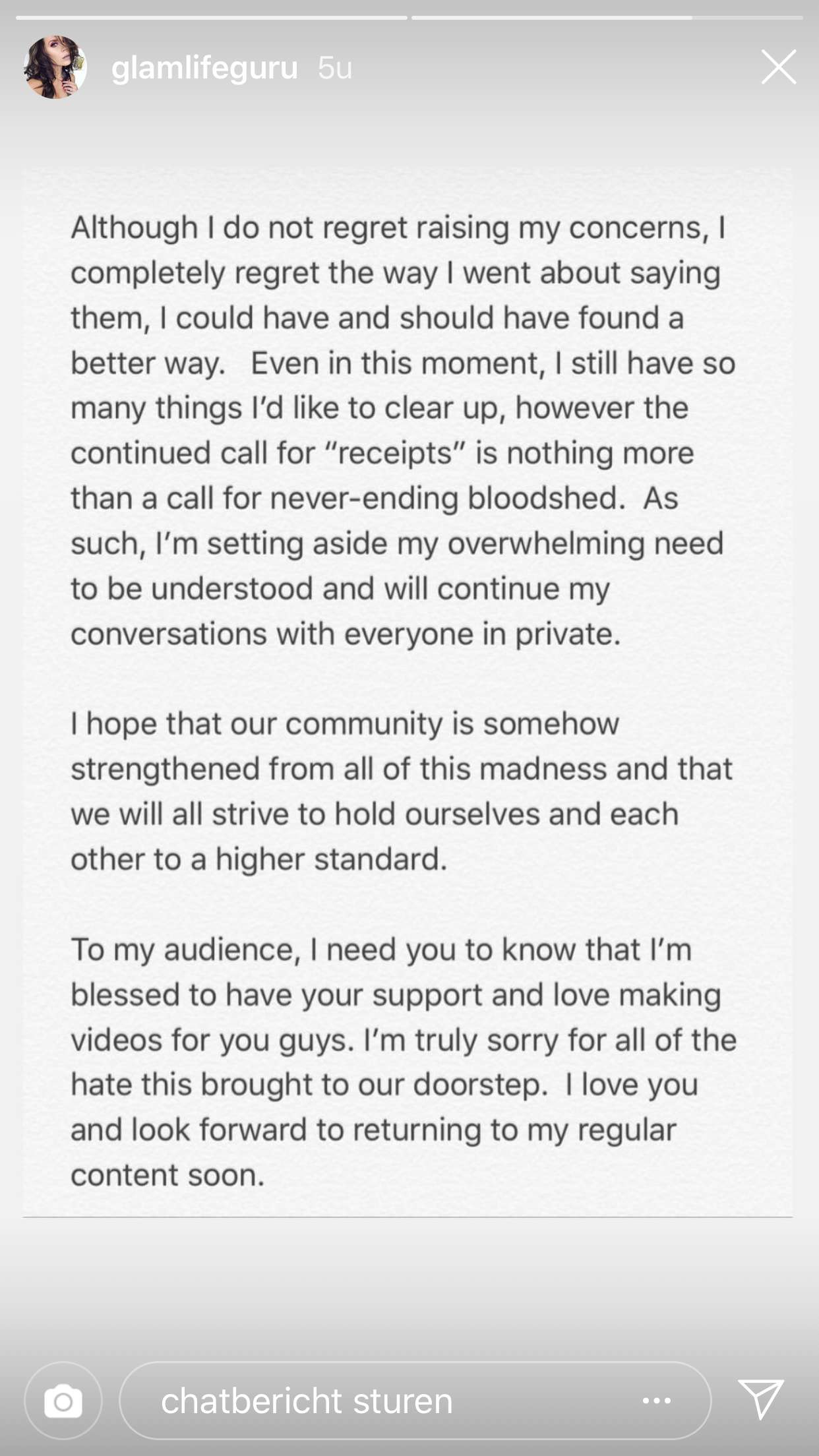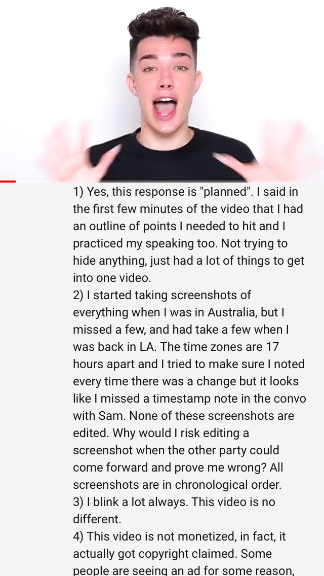 Hij begint met te zeggen dat mensen nu van hem verwachten dat hij ook receipts gaat laten zien maar dat hij dat niet gaat doen. Hij heeft zich laten meeslepen en heeft spijt van wat hij getweet heeft. Hij was in a very dark place maar is blij dat hij er vandaag anders over denkt. Dit moet stoppen, dit gaat om echte levens en is geen spel. Hij insinueert dat hij van alles kan laten zien en horen maar doet dat niet. Hij geeft toe dat het zijn fout was om niet direct met James te praten over z’n issues. Hij zegt dat hij James absoluut niet haat en dat ze een goeie klink hadden maar dat hij meningen van anderen zijn eigen mening heeft laten beïnvloeden. Hij heeft te snel conclusies getrokken en geeft toe dat zijn tweets het allemaal erger hebben gemaakt en dat hij dat privé had moeten oplossen. Hij biedt zijn excuses aan aan Ian, het broertje van James. Weer te snel conclusies getrokken en te snel gereageerd. Maar daar is hij nu klaar mee. Klaar met de tea en drama en andermans situations. Hij schaamt zich voor zijn gedrag en vind dat hij zich gedraagt als Jeffree van een paar jaar geleden. Hij gaat nog even door over hoe hij nooit meer zo zal doen en biedt z’n excuses aan aan James. Hij had een beter vriend moeten zijn.