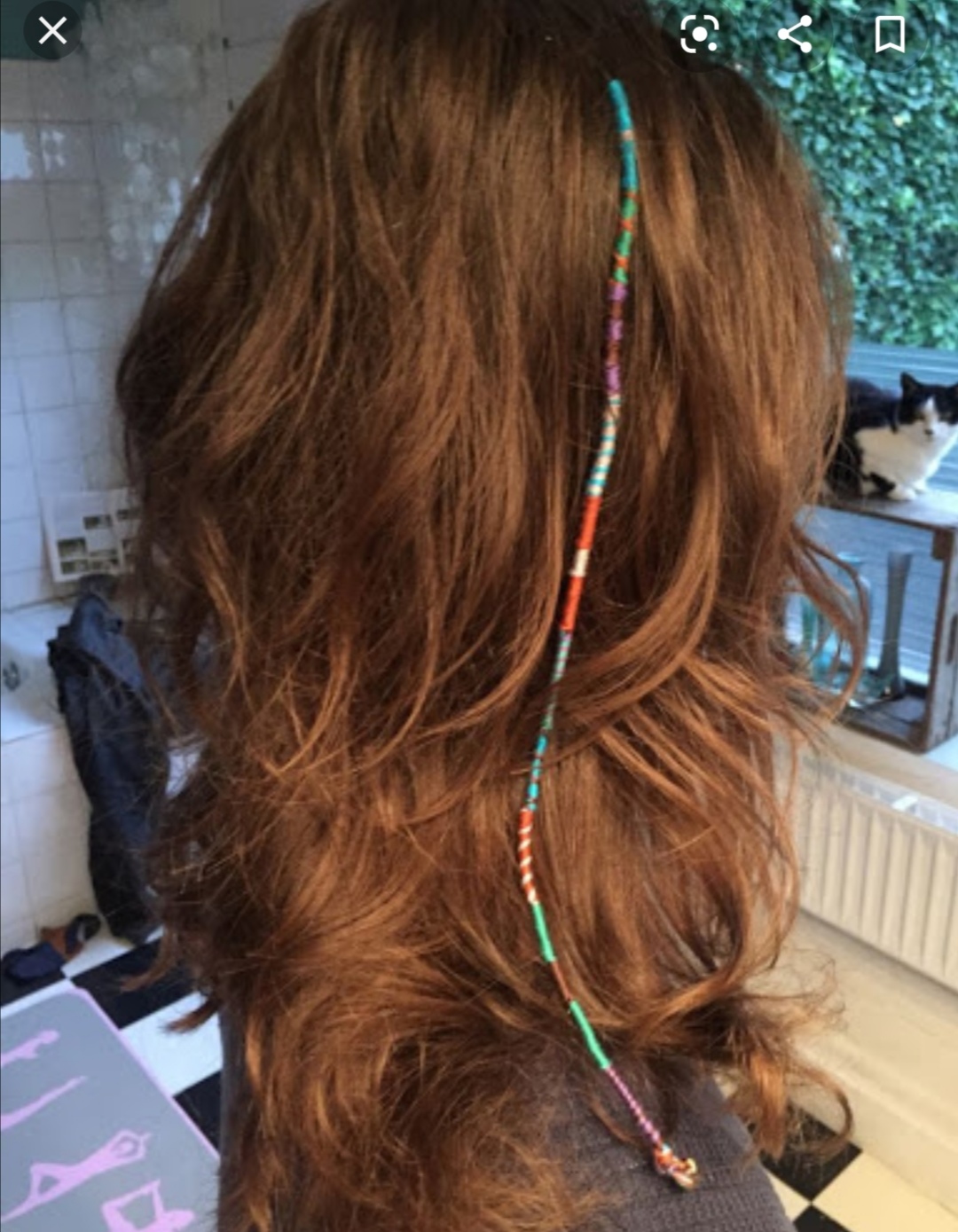 Nee dat was meer dit toch? A la zebra. Had ik ook zo. In koper en later paars (met roze) spoeling. En ook haarmascara in paarse plukken er zo doorheen gegaan. En van die strengen met gekleurde garen. Of een staart van dreadlocks. Ik hing helemaal los.