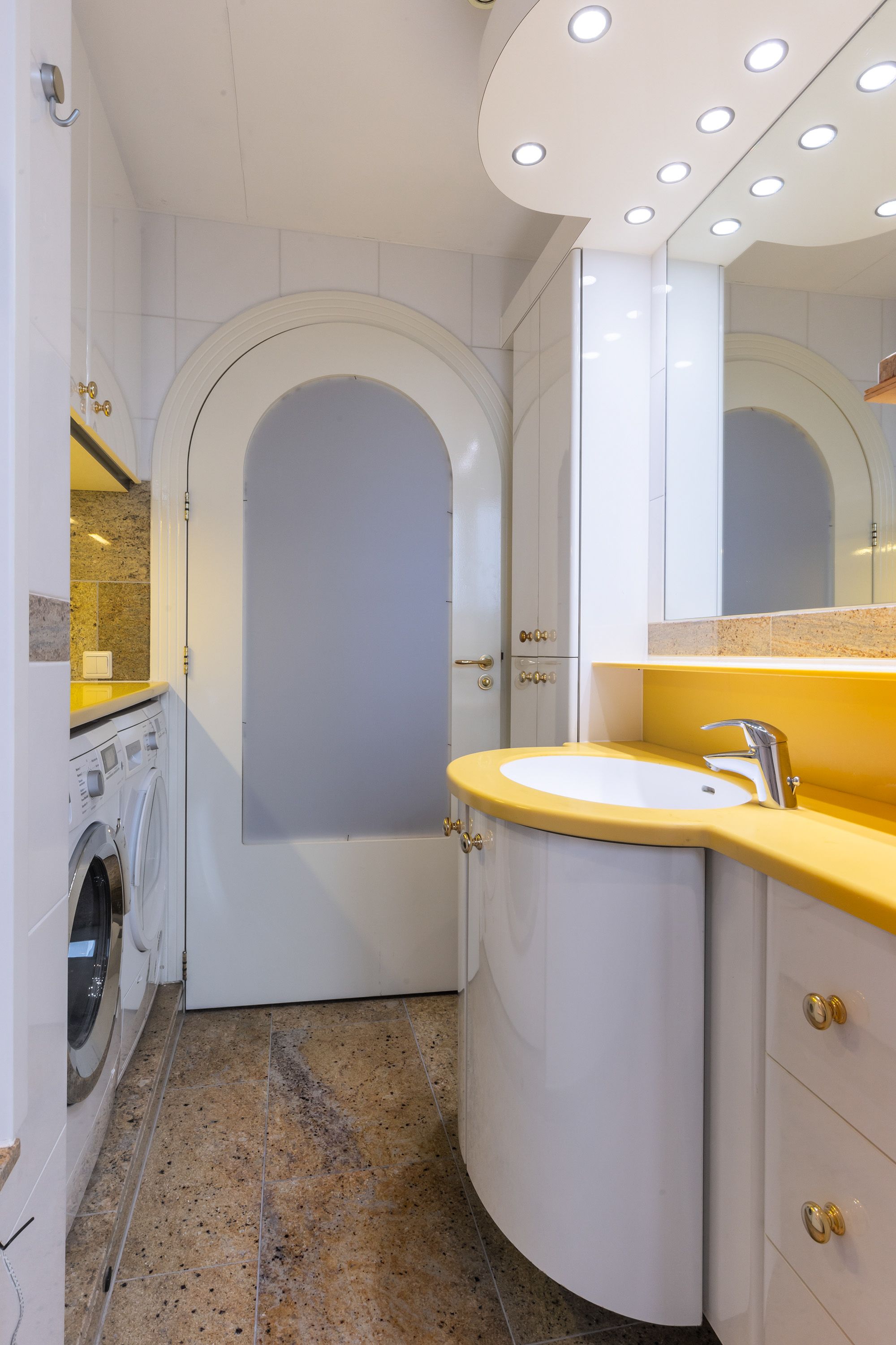 Zoveel vragen. Waarom al die verschillende type vloeren die gek in elkaar over lopen, ronde deuren, de kleuren, wat doet dat bureau daar zo? Waarom zitten er twee aparte toiletten recht tegenover elkaar. Wie heeft deze vorm keuken bedacht? Wat is deze badkamer indeling?