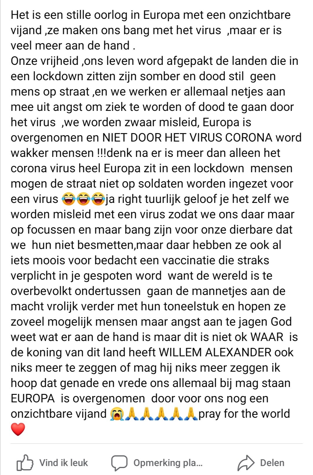 Omg, de Alex Jones van Nederland hoor. Ik zie deze nou ook steeds voorbij komen, kan er niet bij dat mensen dit echt denken. Of dat het een biologisch wapen is om de wereldpopulatie te onderdrukken!! Heb ook al voorbij zien komen dat het een ‘wintergriep is voor mensen met een lage weerstand’. Dit forum is echt een verademing ivm de rest van het internet op dit moment.