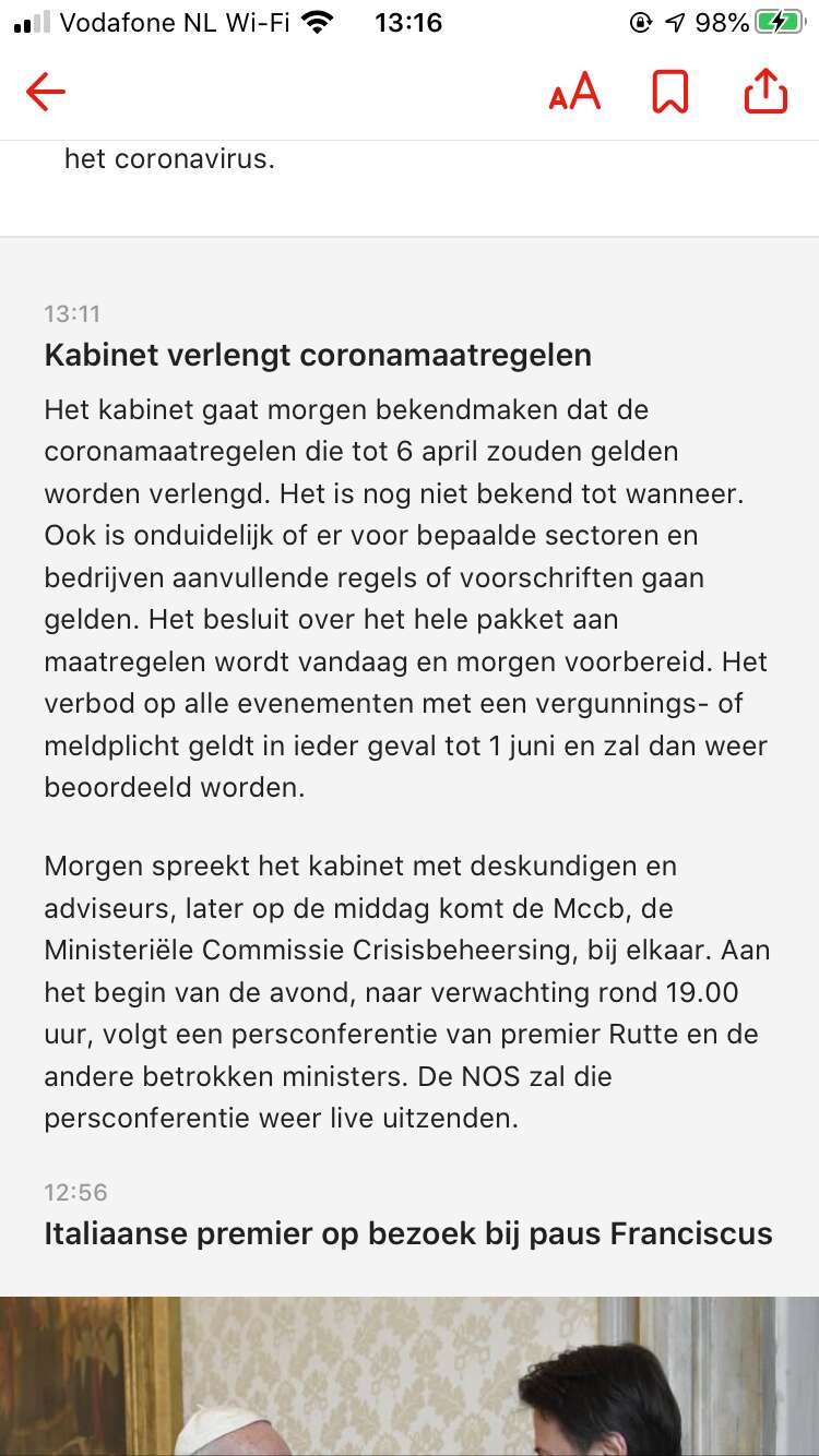 In België hebben ze de maatregelen verlengd tot na de paasvakantie (19 april). Ik denk ook om te voorkomen dat mensen eropuit gaan in de vakantie? Zal me niet verbazen als NL ook volgt en de maatregelen verlengt tot misschien wel na de meivakantie.