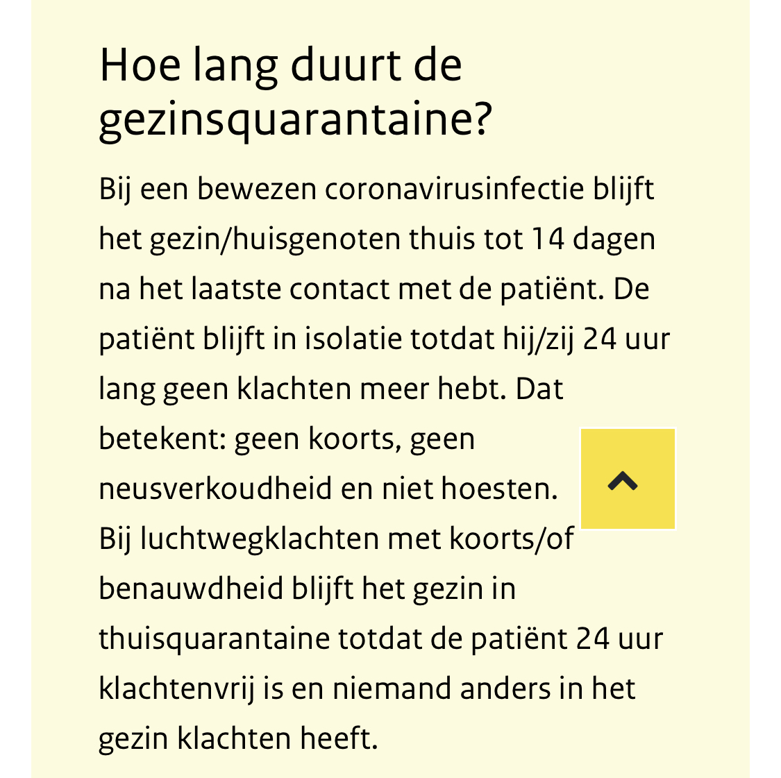 Maar kan het dan ook zijn dat je bijv. 6 dagen veel en ernstige klachten hebt maar dan 24u geen klachten mag je dan wel weer naar buiten? Ook al zijn de 14 dagen nog niet verstreken. Of is het 14 dagen, indien dan nog klachten - wachten tot 24u klachten vrij?