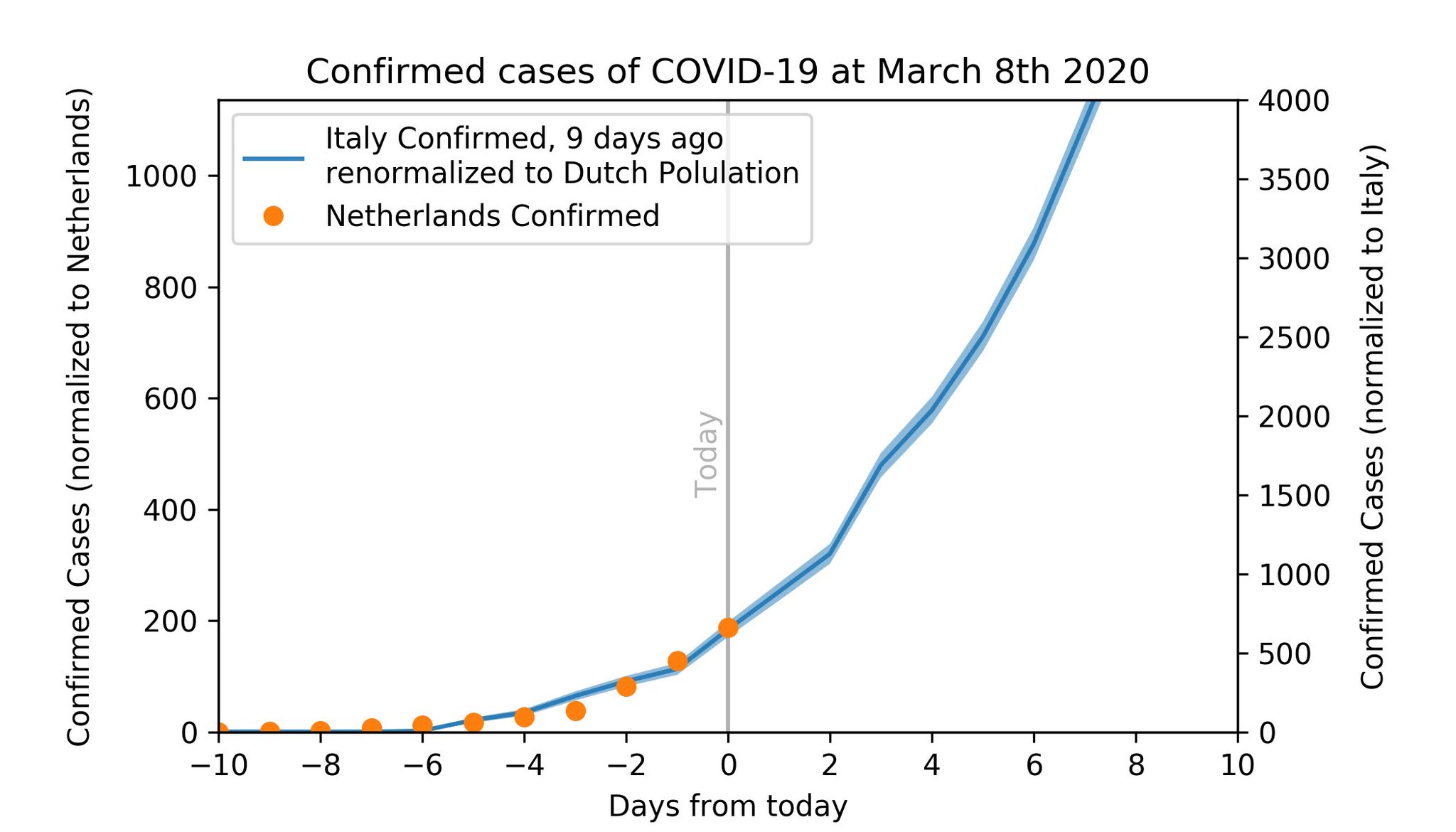 Wow, deze chart is van 8 maart. Qua besmettingraad lopen we dus voor op Italië (genormaliseerd op bevolkingsaantal)