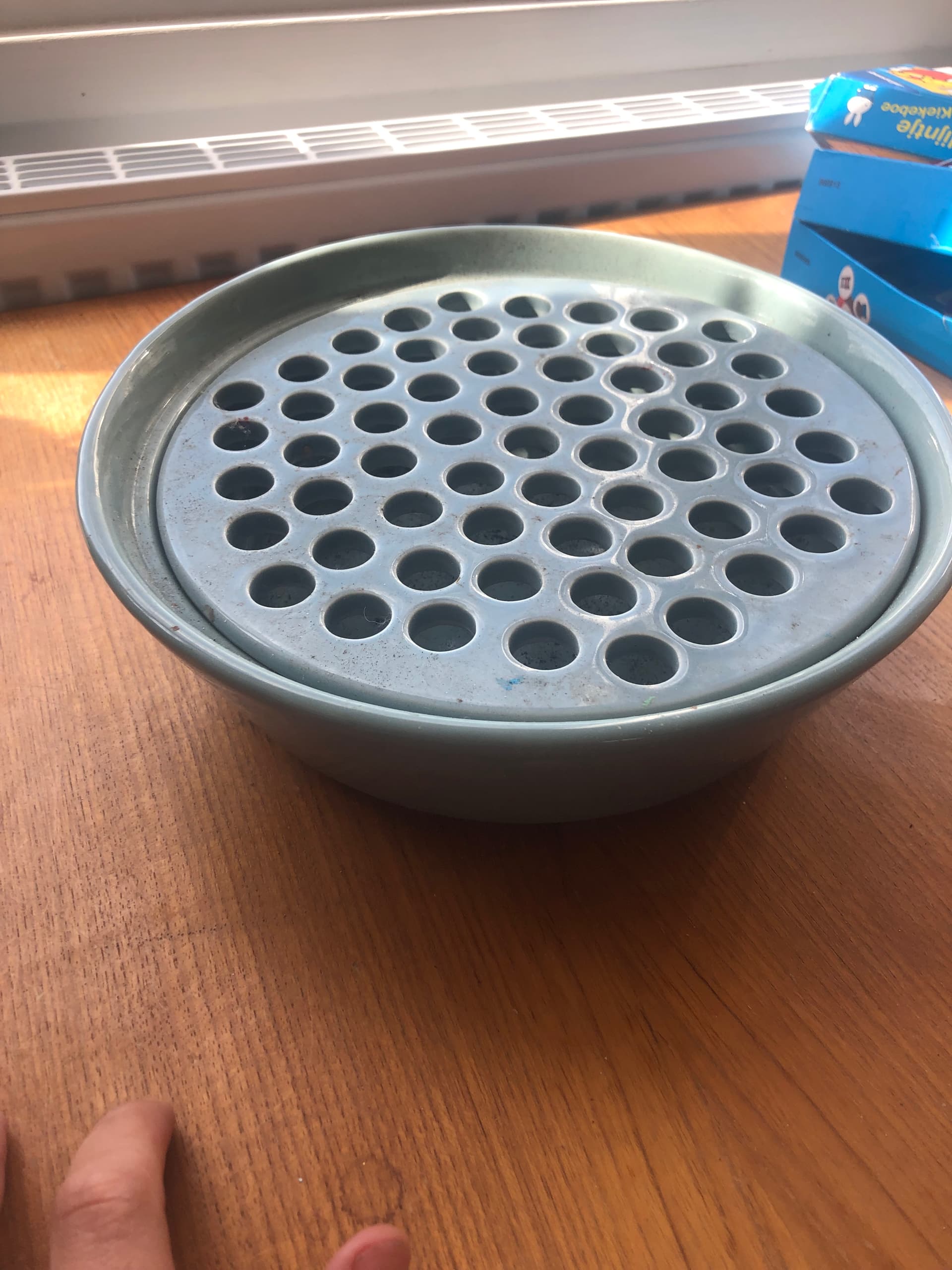 Ik ken dit als ding om te bloemschikken, onderin kun je oase doen, deksel erop en dan de bloemen in de gaten steken.