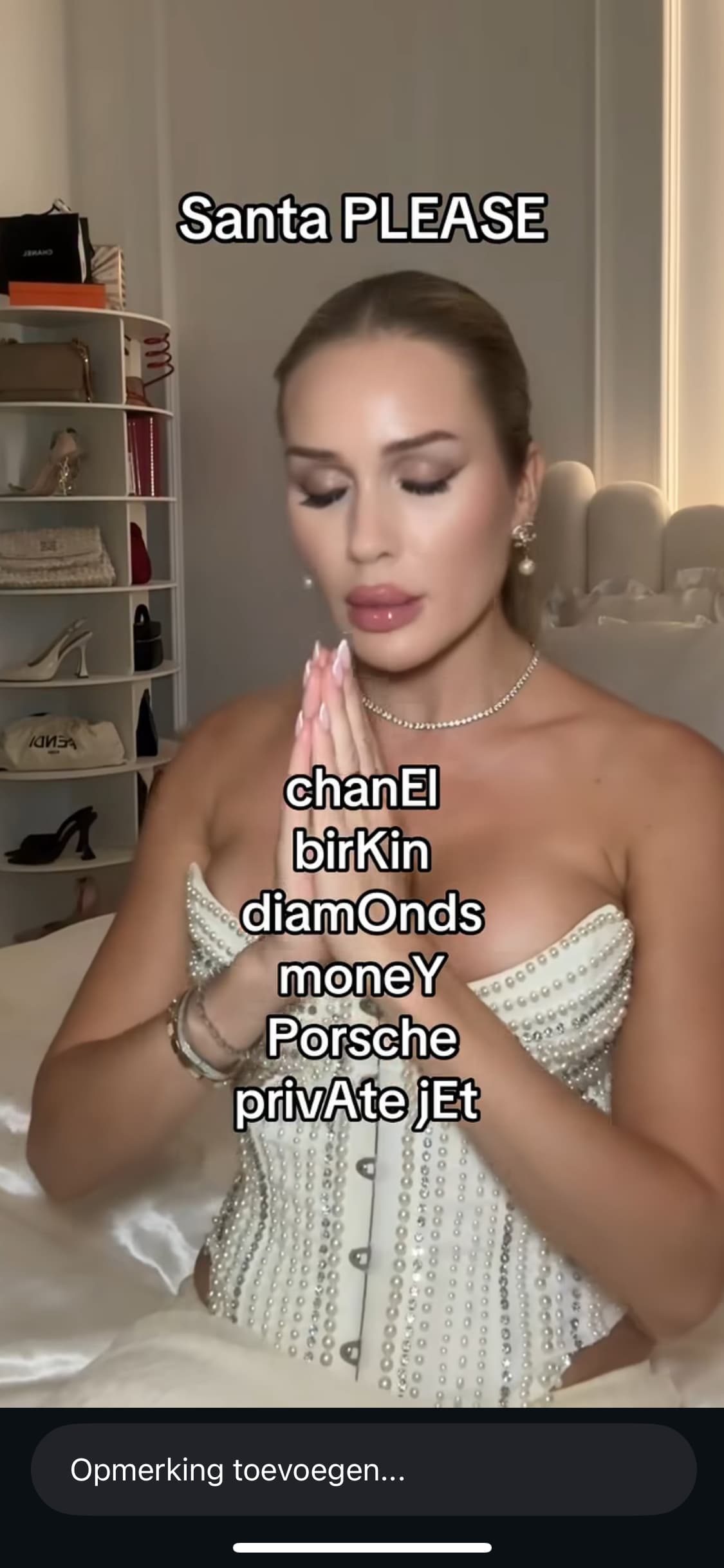 Het is een spottend “gebed” aan Santa Claus waarin iemand doet alsof hij/zij extreem dure en onrealistische cadeaus vraagt.