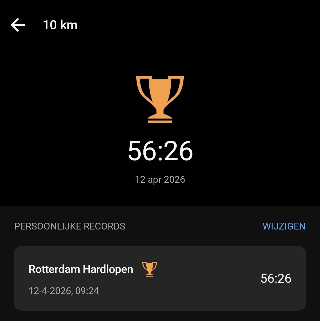 Ja het was druk, ik heb af en toe moeten slalommen om de mensen heen, maar ben blij met het resultaat. Trainer had me als ‘doel’ gegeven om 'm 57 min te lopen, en dat is gelukt!