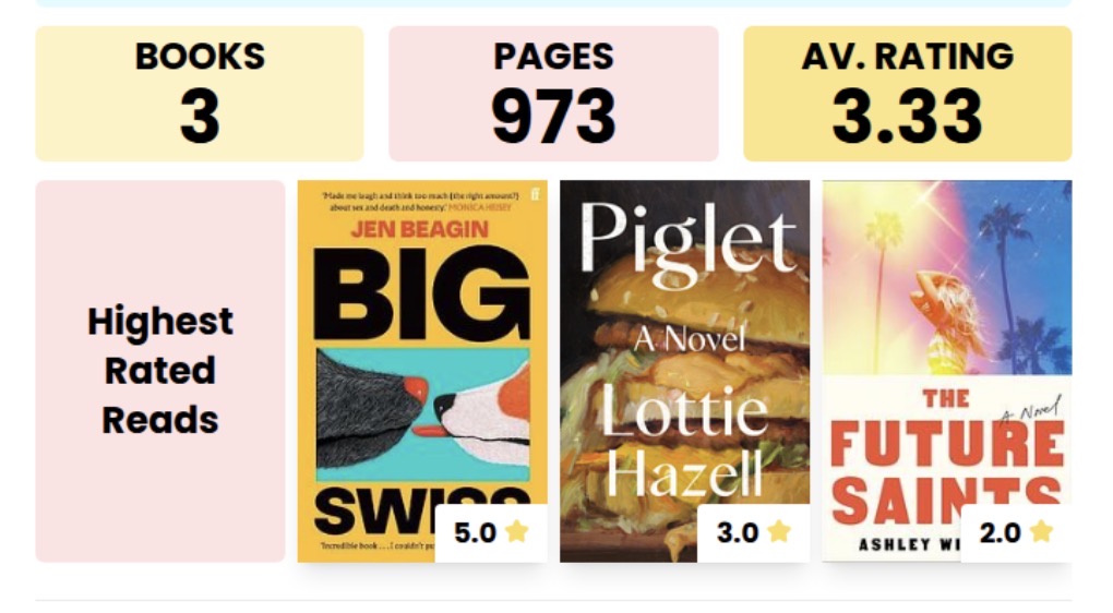 Big Swiss - echt een fantastische boek, ik geef bijna nooit 5 sterren. Het gaat over een vrouw die een transcribent voor een sekstherapeut is. Dan herkent ze 1 van zijn cliënten aan haar stem en raakt ze geobsedeerd. Het is heel erg “quirky” en een beetje vreemd maar dat vind ik juist zooo leuk. Ben gelijk aan een ander boek van deze auteur begonnen.