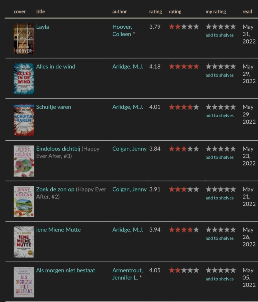 Ik lees echt heel veel voor mân studie momenteel dus pak aanzienlijk minder vaak een boek erbij, maar mei ben ik alsnog wel tevreden over.