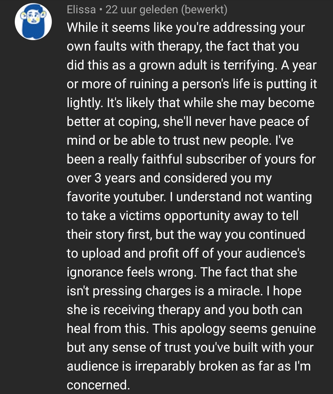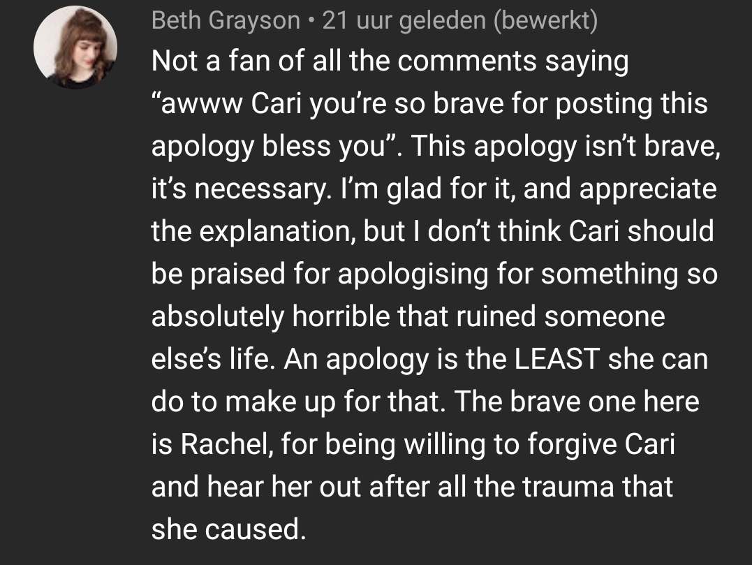 Ja maar lees ook wel comments waar ik me meer in kan vinden hoor, die ook veel bijval krijgen. Maar eens, dit is niet zoiets waarmee je met een video weer alles goedmaakt en heb er zelf ook een beetje een naar gevoel bij (rondom haar).