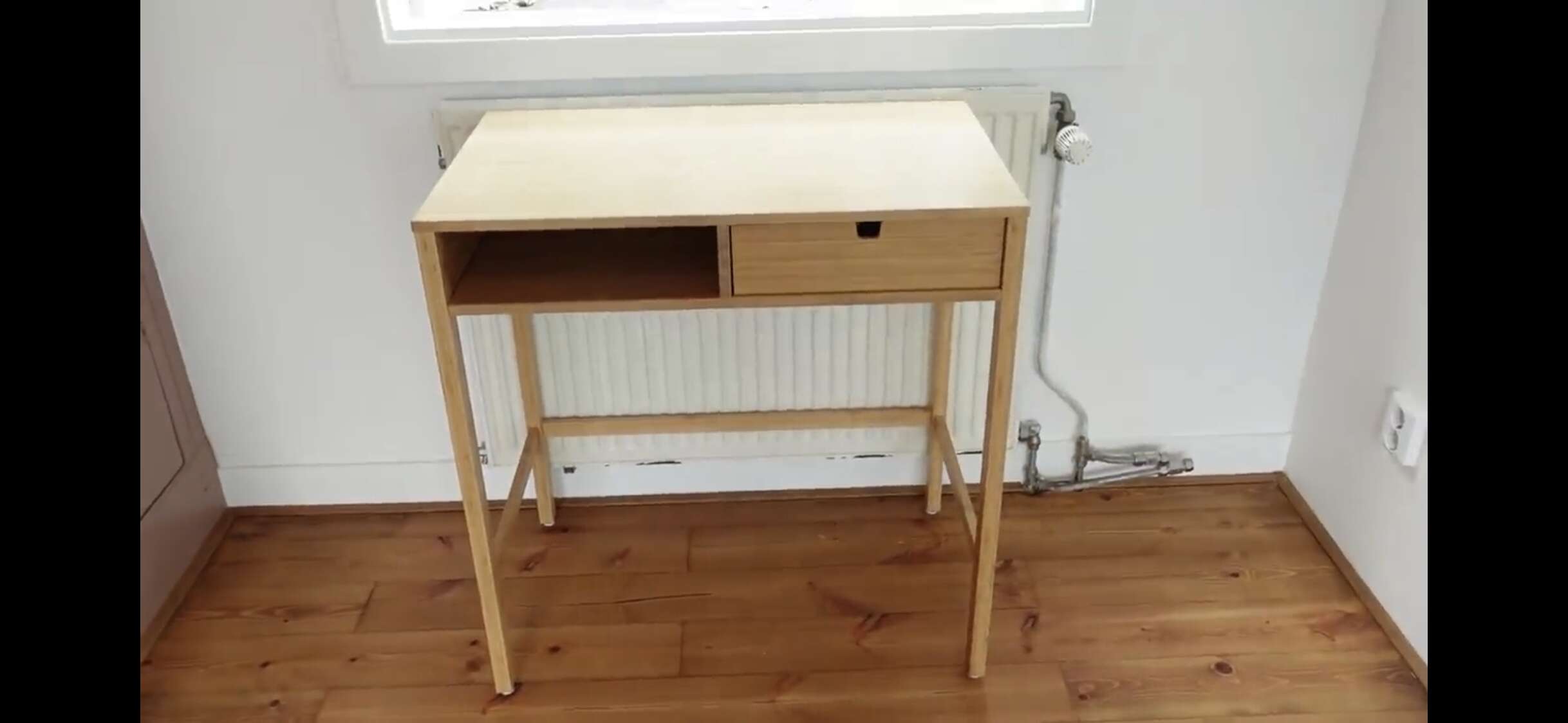 Jeetje wat lelijk dat bureautje. Net te klein om die kachel volledig te bedekken