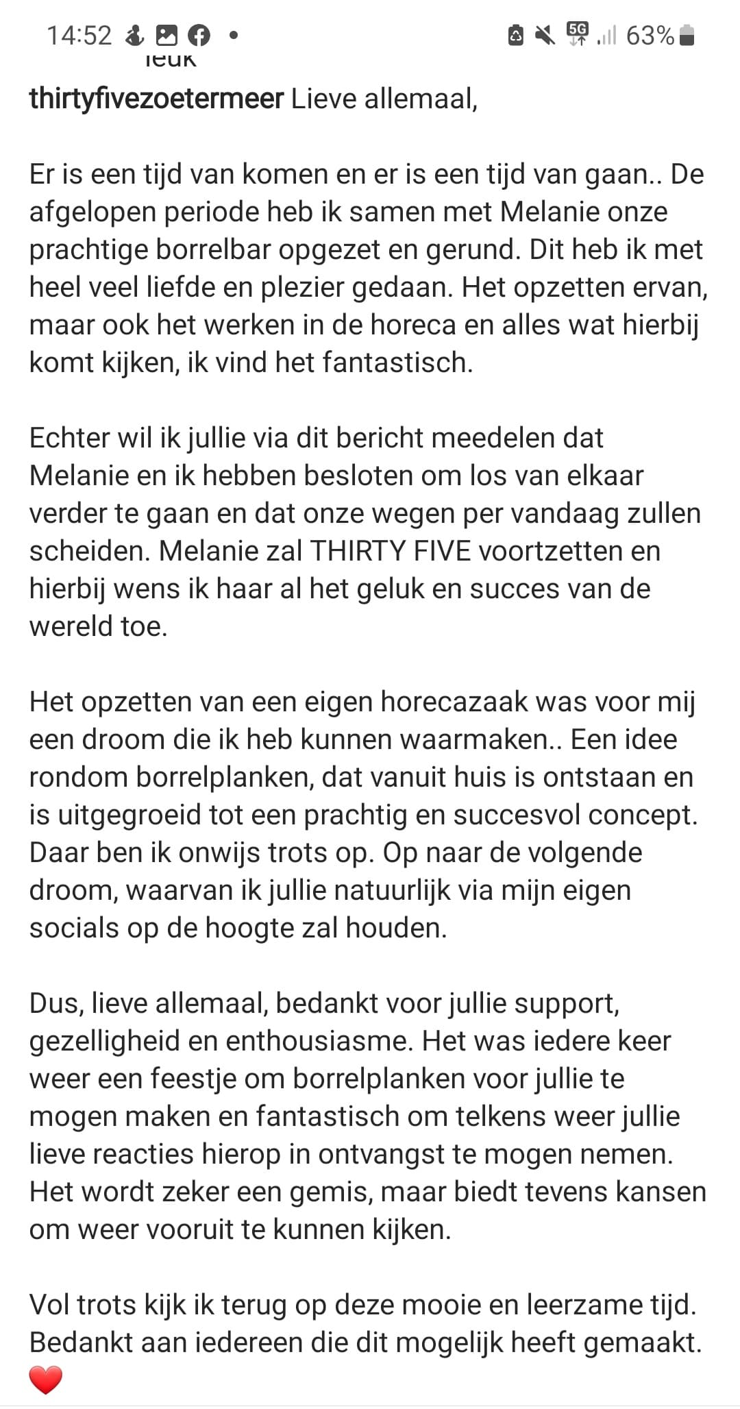 Had ik ook niet verwacht. Zal ook wel een nare bijsmaak hebben dat Melanie er wel mee doorgaat.