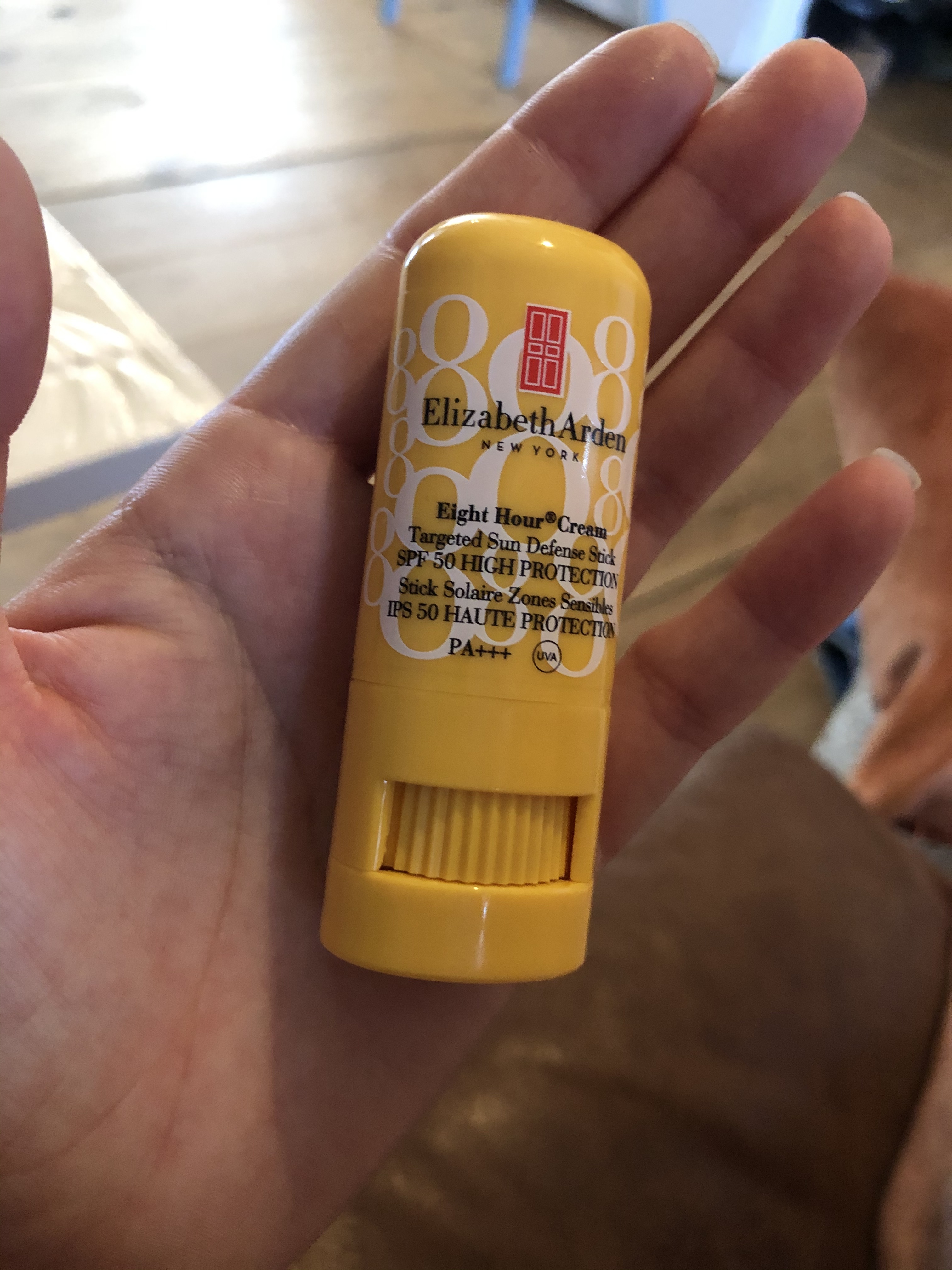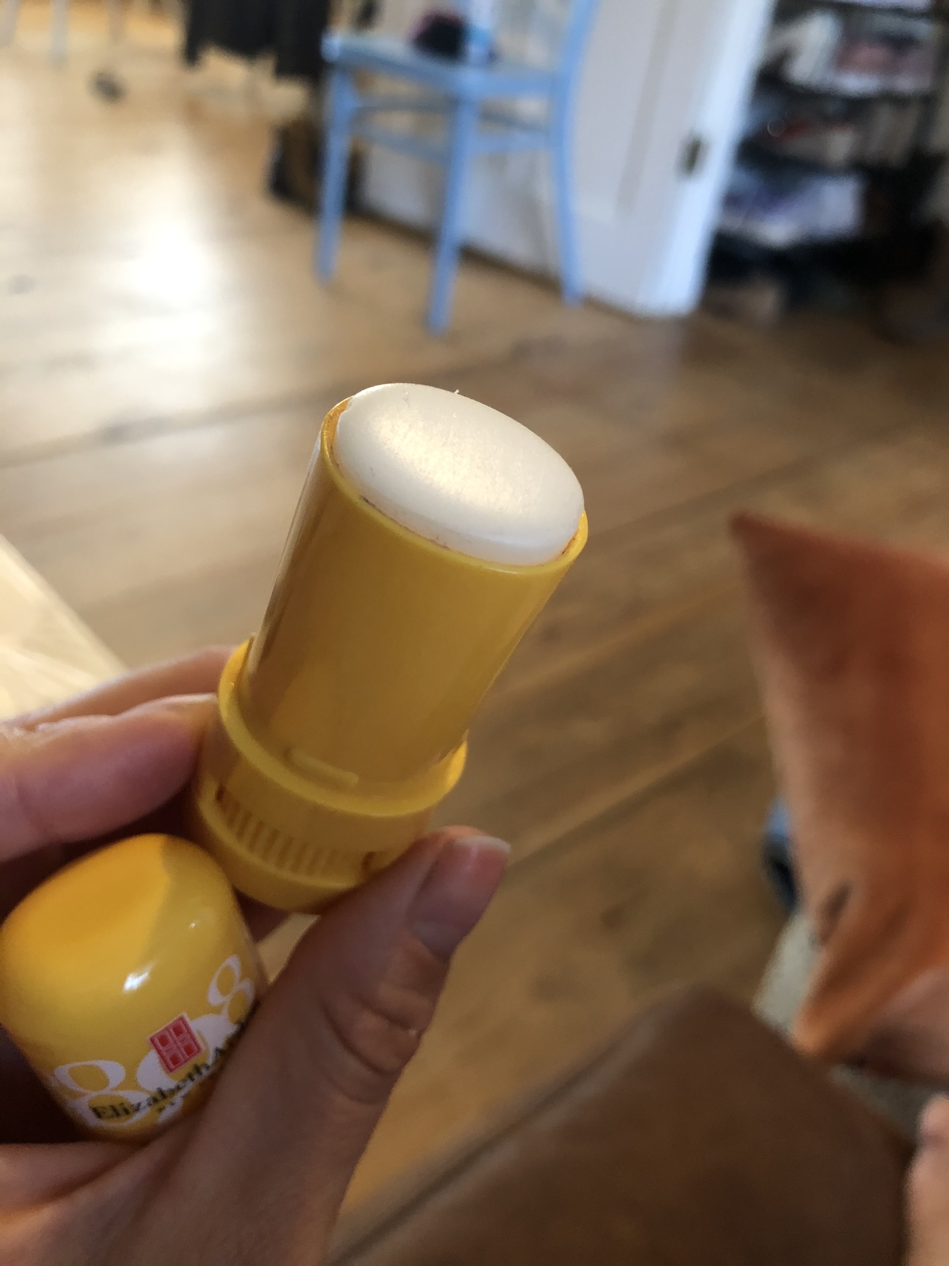Ik streep daarmee m’n sproeten, voorhoofd, bovenlip en wallen af omdat ik geen sproeten, pigmentvlekken en rimpels wil, daarna gooi ik de stick in m’n tas en doe ongeveer om het uur opnieuw.