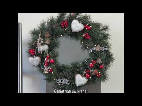 Bij de kerstkrans gebruik ik een lint en dat hamer ik een platte punaise in de bovenkant van de deur. Als je een houten deur hebt, is dat prima.