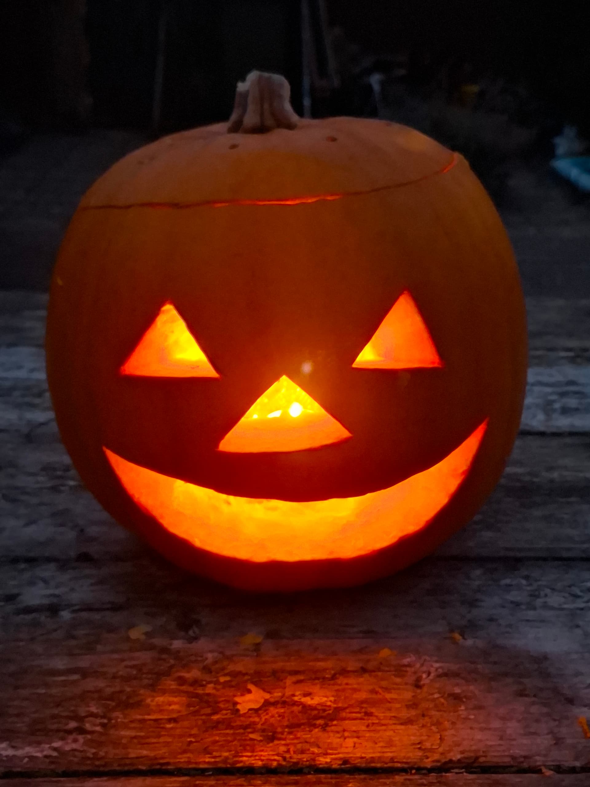 Vandaag voor het eerst een pompoen uitgehold en uitgesneden, samen met mijn neefje. Hij staat in de tuin en zie hem steeds in mijn ooghoek ![]()