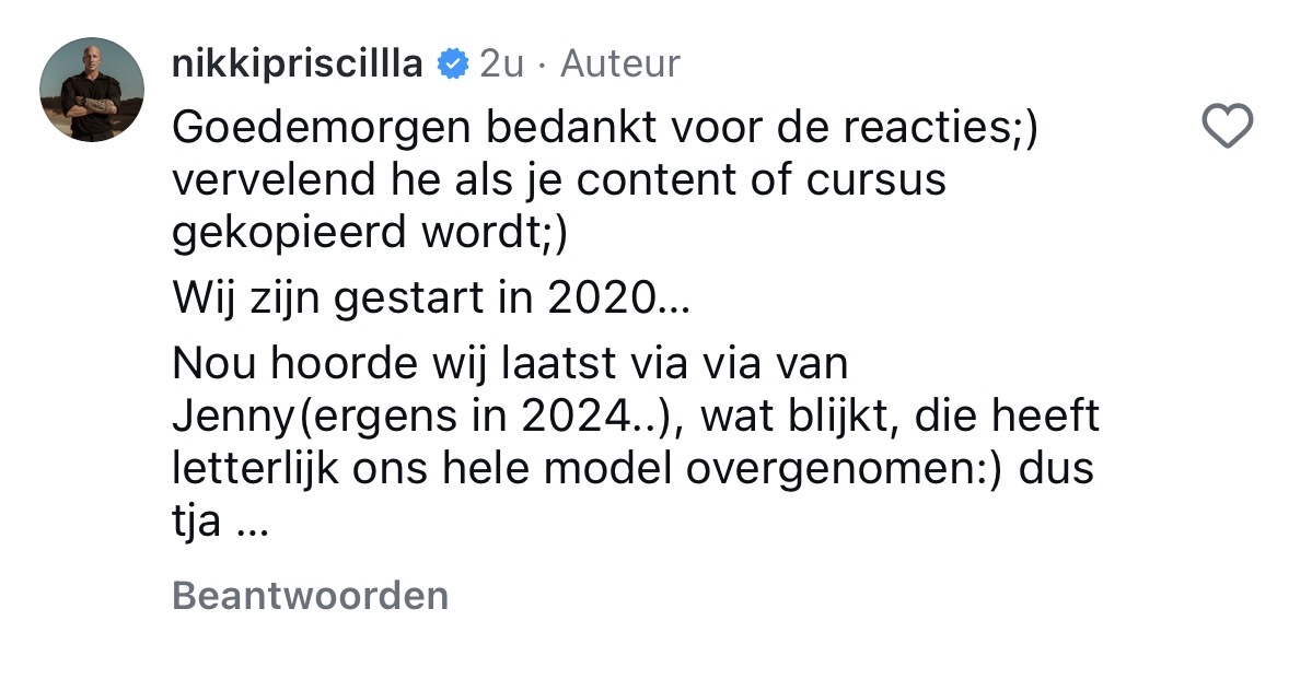 Wie als eerst de cursus heeft gegeven moeten ze onderling maar uitvechten maar Jennie maakt volgens mij een terecht punt over de content op de Instagram toch? Want die is wel echt 1-op-1 nagemaakt.
