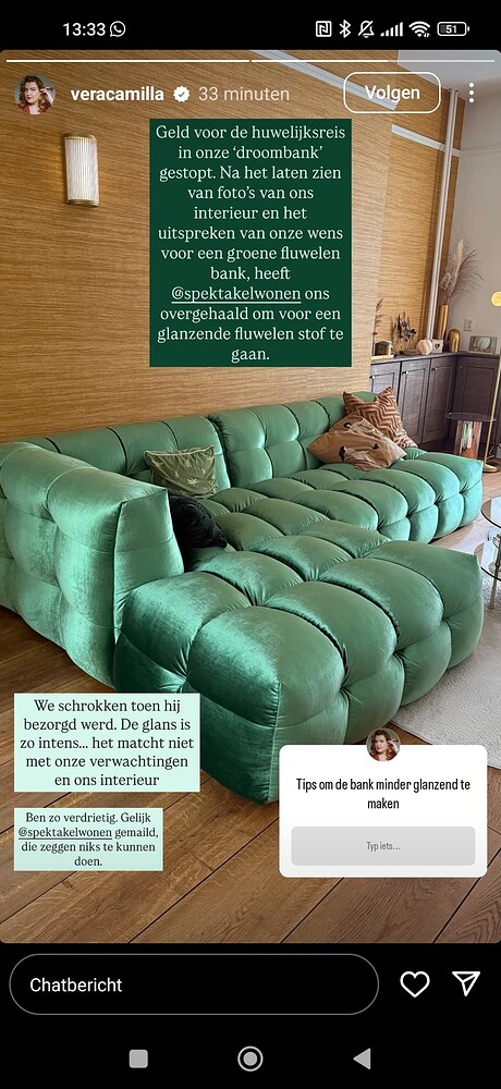 Hij is groot voor haar ruimte en misschien moet je even terugscrollen om die bank in vol daglicht te zien. Vera vond hem zelf lelijk want ze heeft dan op insta die winkel ge-out waardoor haar volgers die winkel online aanviel.
