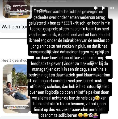 Maar dat vind ik wel ik die meiden die eh zijn echt die verdienen echt alle credits, want ze werken zo hard. Ik heb zeg maar zelfs meiden die mij persoonlijk bellen. Ik ga niet niet namen noemen, want het is niet nodig, die mij persoonlijk bellen en die tegen mij zeggen: âAnders betaal me maar een paar maanden geen salaris als het je helpt. Betaal maar een paar maanden niet. Dan gaan we met zân allen volle bak gas geven en dan klimmen we er weer uit.â Weet je wel dat ik heb leveranciers die zeggen mies we weten zeg maar wat je visie is.
