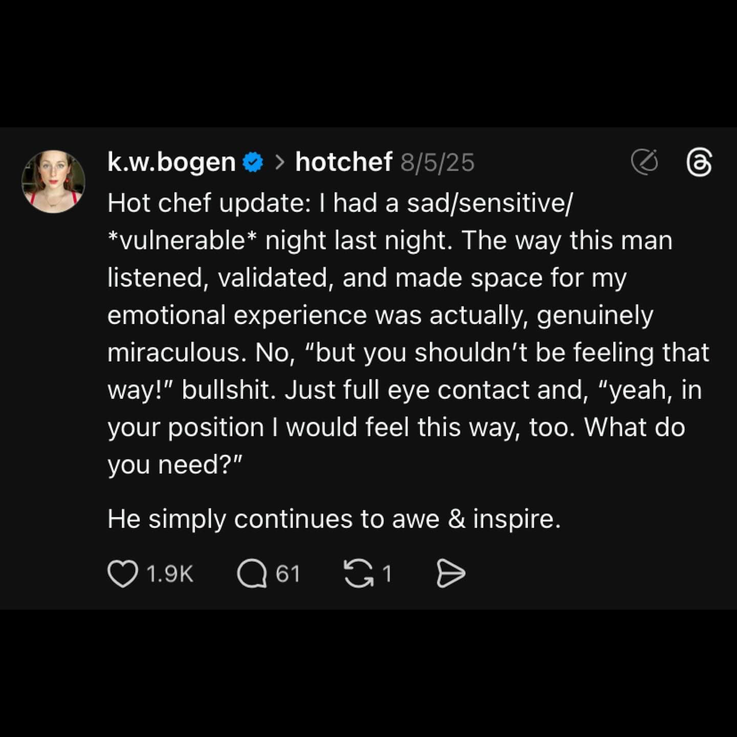 lol dit is echt te niche maar ik ga het toch delen. Ik heb dit verkeerd onthouden; het was een instagramvrouw, soort van een influencer? Ben haar gaan volgen omdat ik haar Palestina-posts goed vond, en toen werd haar content opeens alleen nog maar ‘ik heb een hete chef ontmoet in Parijs’