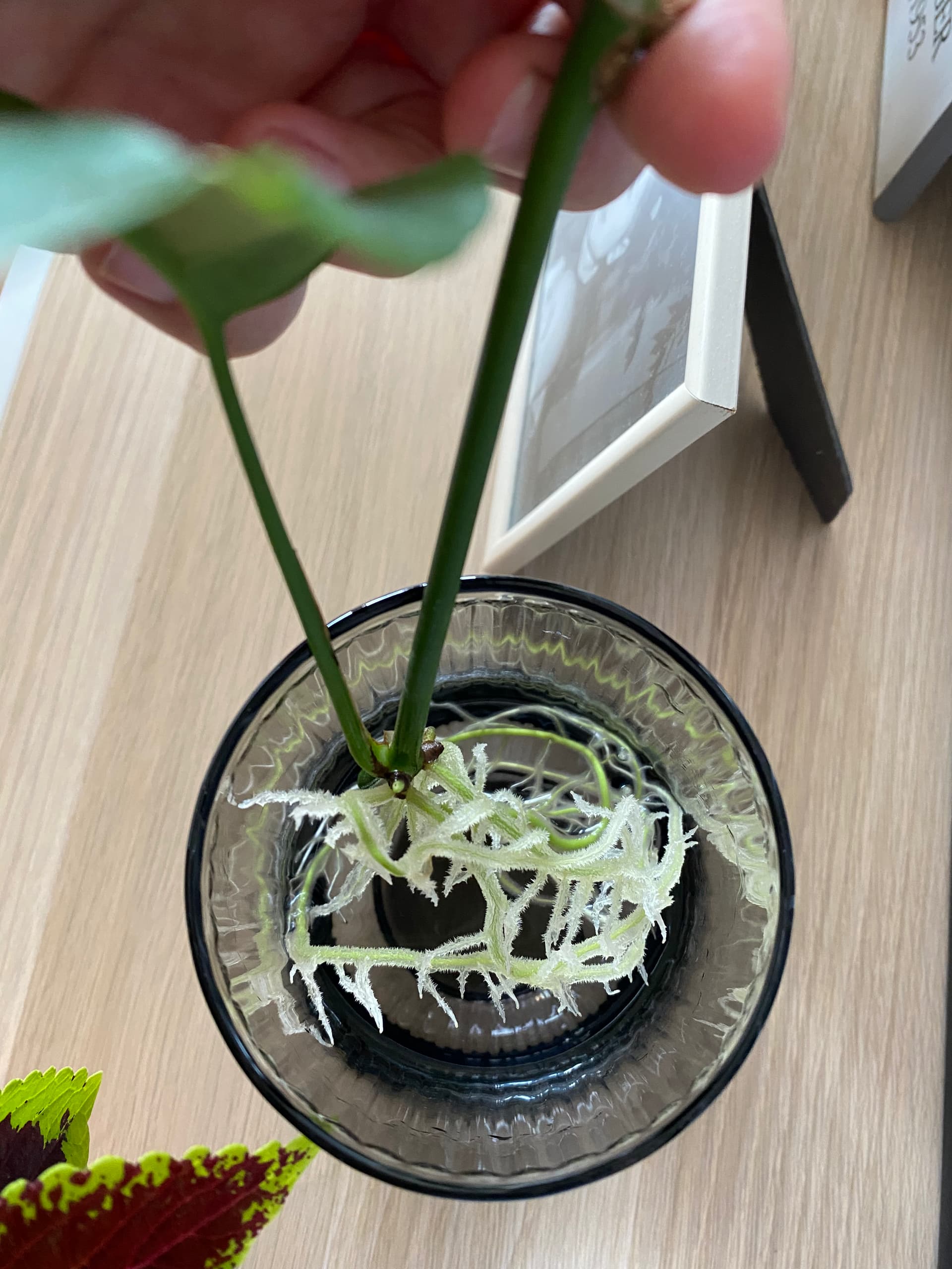 Wow. Deze plant verloor ineens zijn bladeren dus ik heb heel rigoureus de bovenste kant afgeknipt en op water gezet. De stam heb ik bewerkt en nu komen er - binnen twee weken al! - verschillende nieuwe bladeren aan. Dit maakt me zo blij!