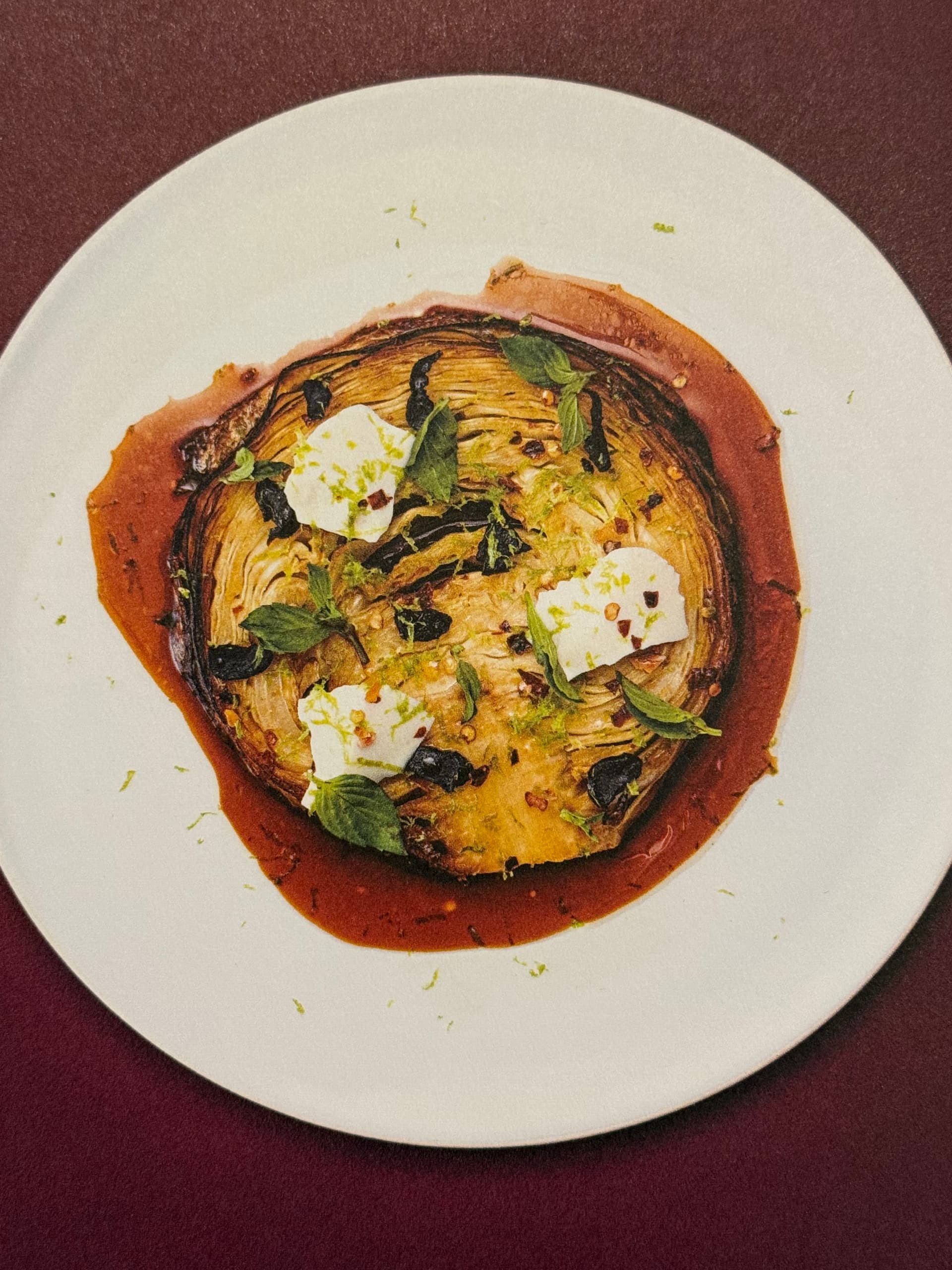 Snijd de kool in plakken van 1 cm dik. Leg de kool op borden en schep er sojaboter en een paar lepels zijdetofu over. Bestrooi met geraspte limoenschil, eventueel zwarte knoflook (kan soms moeilijk te vinden zijn), Thaise basilicum en chilivlokken. Breng naar wens op smaak met een beetje zout.