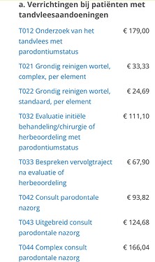 Ze heeft bij 2x t043 gerekend + aparte intake kosten van ongeveer 80 euro. Volgens de mondhygiënist had ik geen parodontitis, alleen tandvlees ontsteking en een ontsteking bij m’n implantaat.