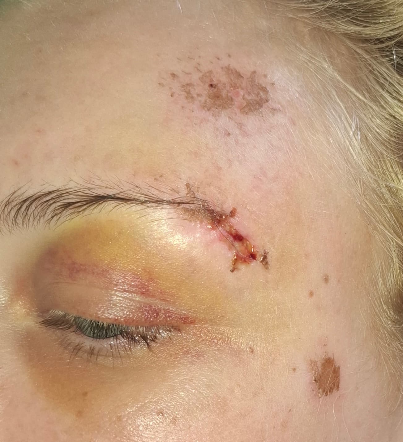 Voor de liefhebber een extra foto van de wond in een spoiler. De wond is gelukkig veel minder diep dan ik dacht! Wel lekker blauw en geel overal.