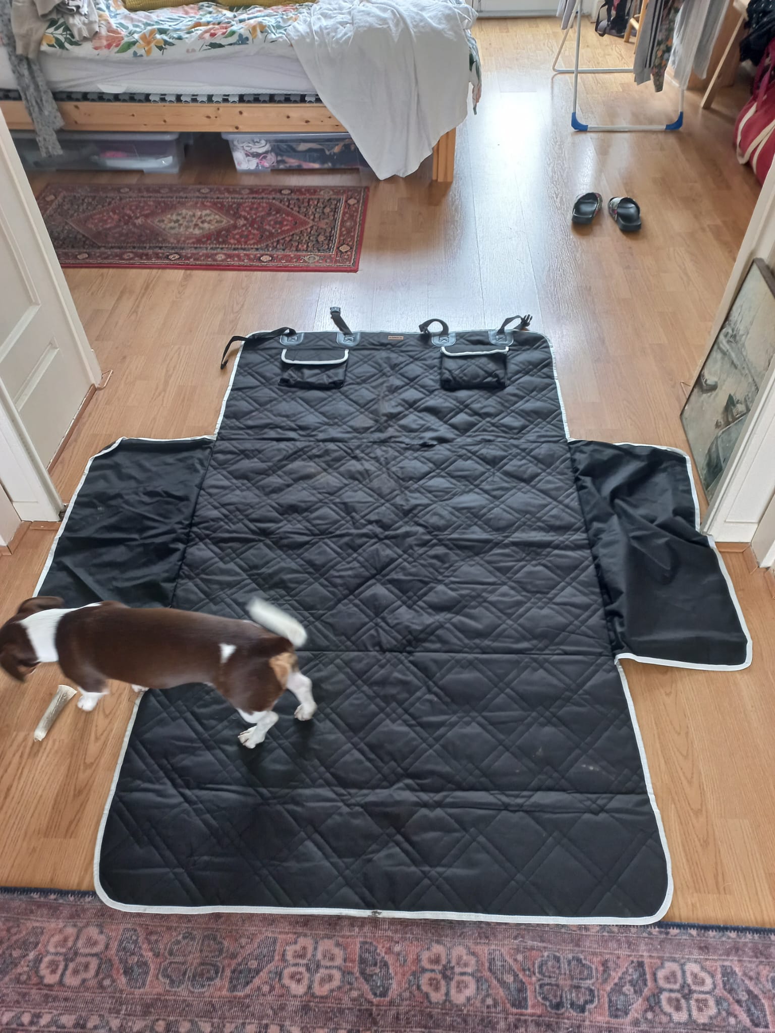 Wil iemand dit kleed voor in de auto hebben? Ik heb het van een vriendin gekregen, paar keer gebruikt maar ik heb zo’n klein hondje dat ik het een beetje zonde vind dat het kleed mijn hele achterbank in beslag neemt. Het is wel handig, je klikt het vast aan de hoofdsteunen en je kan het ook helemaal over de zijkanten/stukje waar je je voeten normaal zet hangen. Er zit een opening in geknipt (heeft mijn vriendin gedaan) waar de gordel doorheen kan, zie foto. Misschien heeft iemand er nog iets aan; ik hoef er niets voor, alleen verzendkosten! ![]()