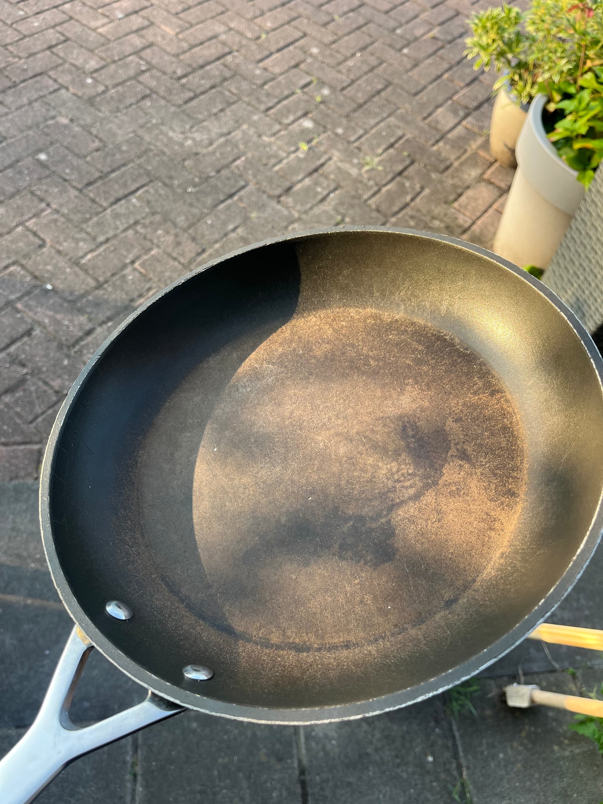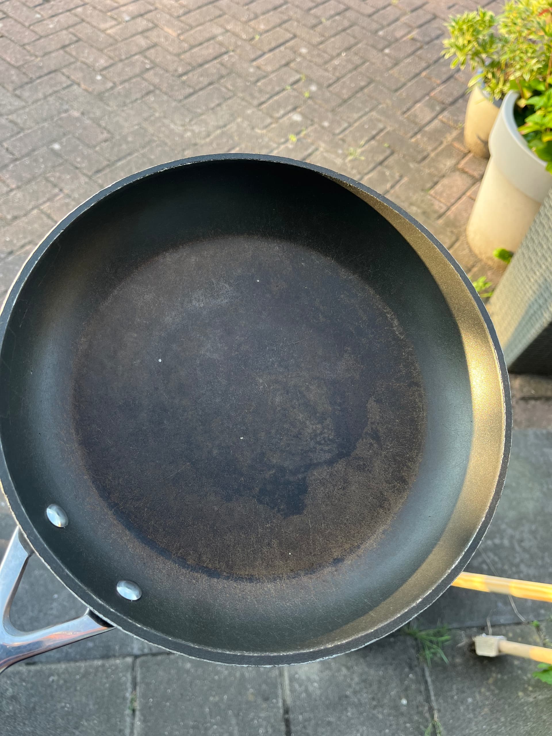 Hoe lang heb je hem gebruikt dan? Op die foto’s ziet hij er voor mij gewoon versleten uit, lijkt dat de anti-aanbaklaag gewoon helemaal kapot is.