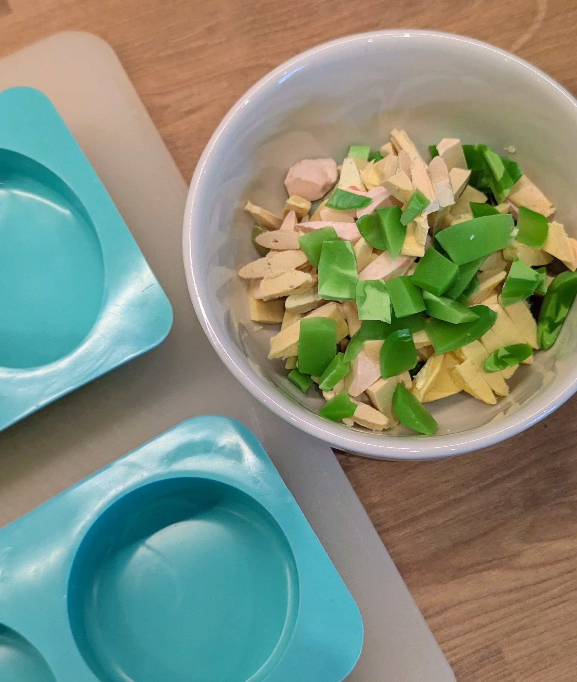 Als je zeepjes hebt met een verschillende textuur kan het zijn dat de ene zeep sneller smelt dan de ander en dan krijg je stukjes. Mijn groene zeep was harder dan de gele. Ik vond dat juist wel leuk want nu heeft het groen-gele mengsel vlekjes gekregen, met een beetje fantasie lijkt het op kruidenboter.