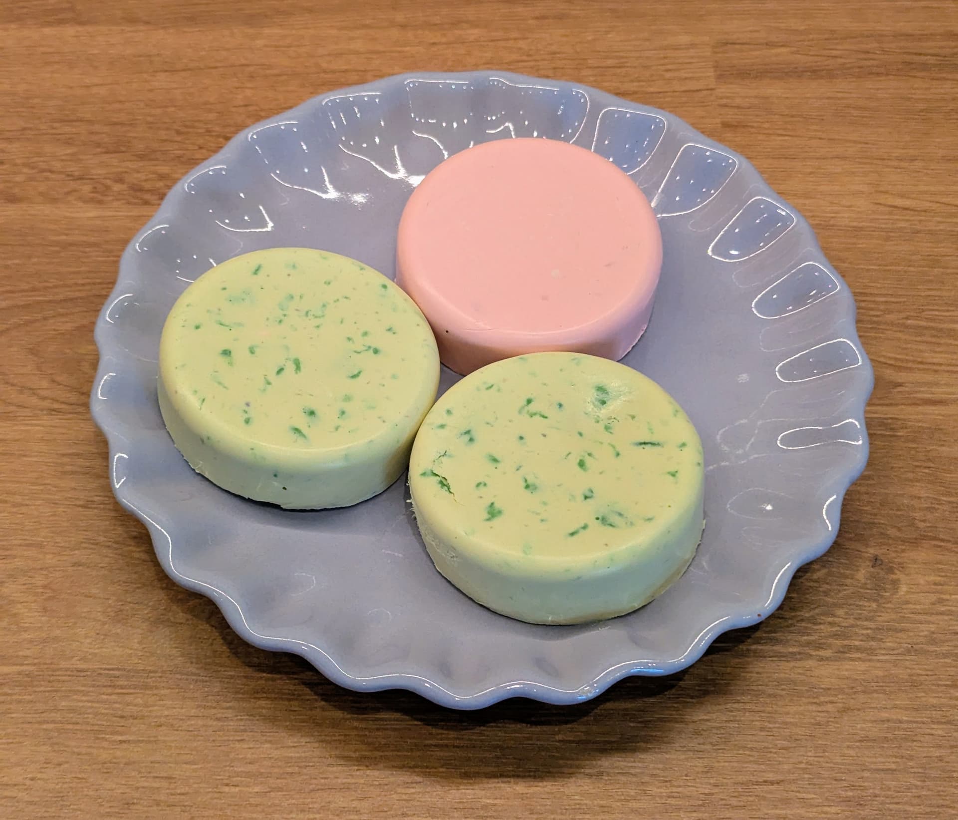 Het groen-gele mengsel had zo’n 50 seconden nodig, het roze mengsel (wat ook een stuk minder was) slechts 20. Het vloeibare zeepmengsel doe je in vormpjes; ik gebruikte ronde siliconenvormpjes.