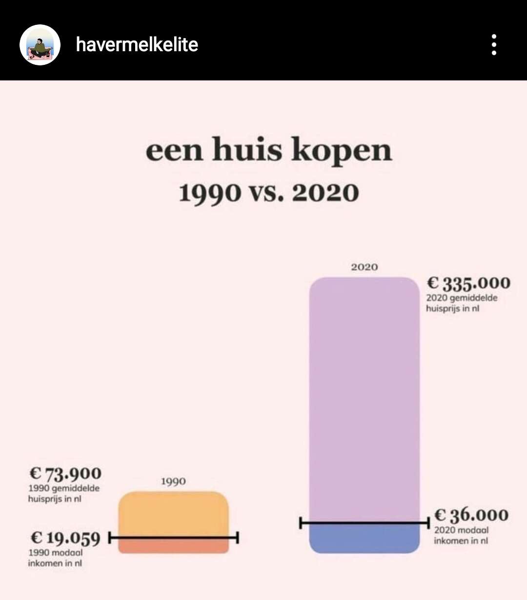Edit: Er wordt altijd gedaan alsof er vroeger niet net zogoed lanterfanters, langstudeerders, mensen zonder spaardiscipline etc bestonden. Die waren er net zo goed. Verschil met nu? Voor het gross van de mensen gold dat er een moment kwam waarop ze serieus werden en dan kon je gewoon nog âmeedoenâ. Dan bedacht je op dat moment een paar jaar te gaan sparen en kocht je een huis. Dat je kan bijstellen en repareren is een teken van een gezonde maatschappij. Zeker nu de wereld er anders uit ziet en nieuwe ontwikkelingen ervoor zorgen dat het logisch is dat je niet meteen aan huisje tuintje kindje committeert. Mijn eigen ervaring is nu dat je nominaal kan afstuderen, vanaf seconde één keihard kan sparen en hopeloos bent op de markt (in mijn eentje zou ik niks kunnen). Dat is gewoon Ă©cht een ander verhaal dan mijn schoonouders die op één inkomen met meerdere kinderen een hoekwoning kochten. En dat ligt dan niet aan absurde eisen, per se in de stad willen (we kijken al maanden ook erbuiten) of kieskeurig zijn. Simpelweg aan extreme prijsstijgingen. Voorbeeld: de woning die mijn vriend in 2017 in zijn eentje kocht is inmiddels dicht bij een verdubbeling van de waarde. Kortom: hij zou hem nooit meer alleen kunnen komen.