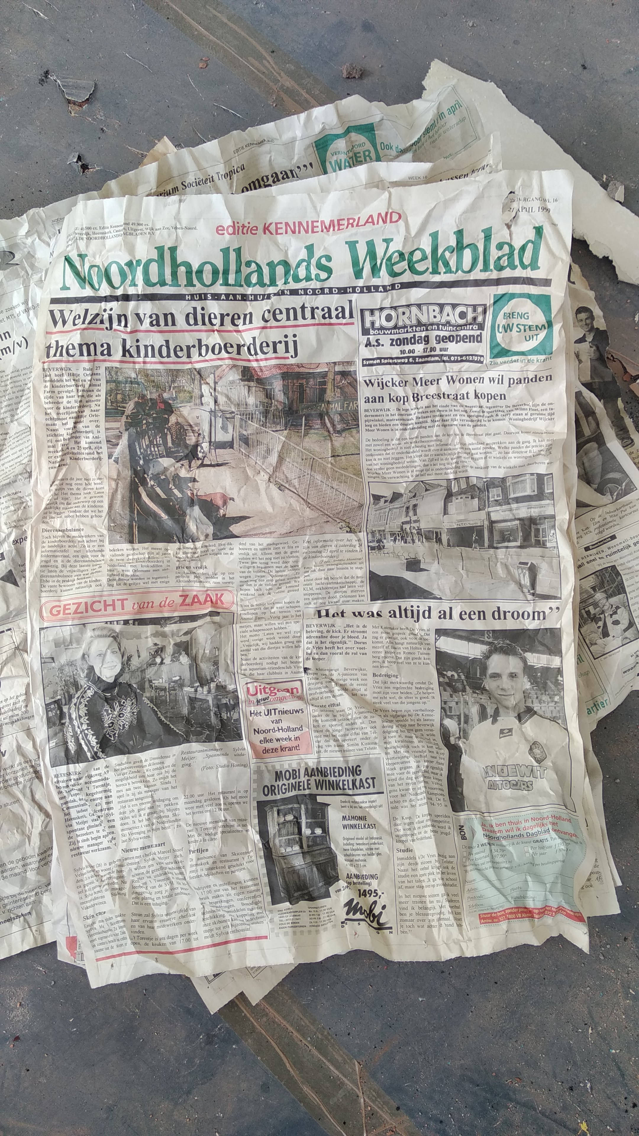 Ah ja, dat hadden wij ook nog gevonden! Een krant uit 1993 onder de vloer. Onze aannemer zei dat dat ook wel wordt gedaan als een soort aantekening van hoe oud de vloerbedekking is oid. In de categorie minder leuke vondsten ontdekten we op diezelfde krant de aantekening ‘asbesthoudende lijm’ en onder het asbest een loden leiding.