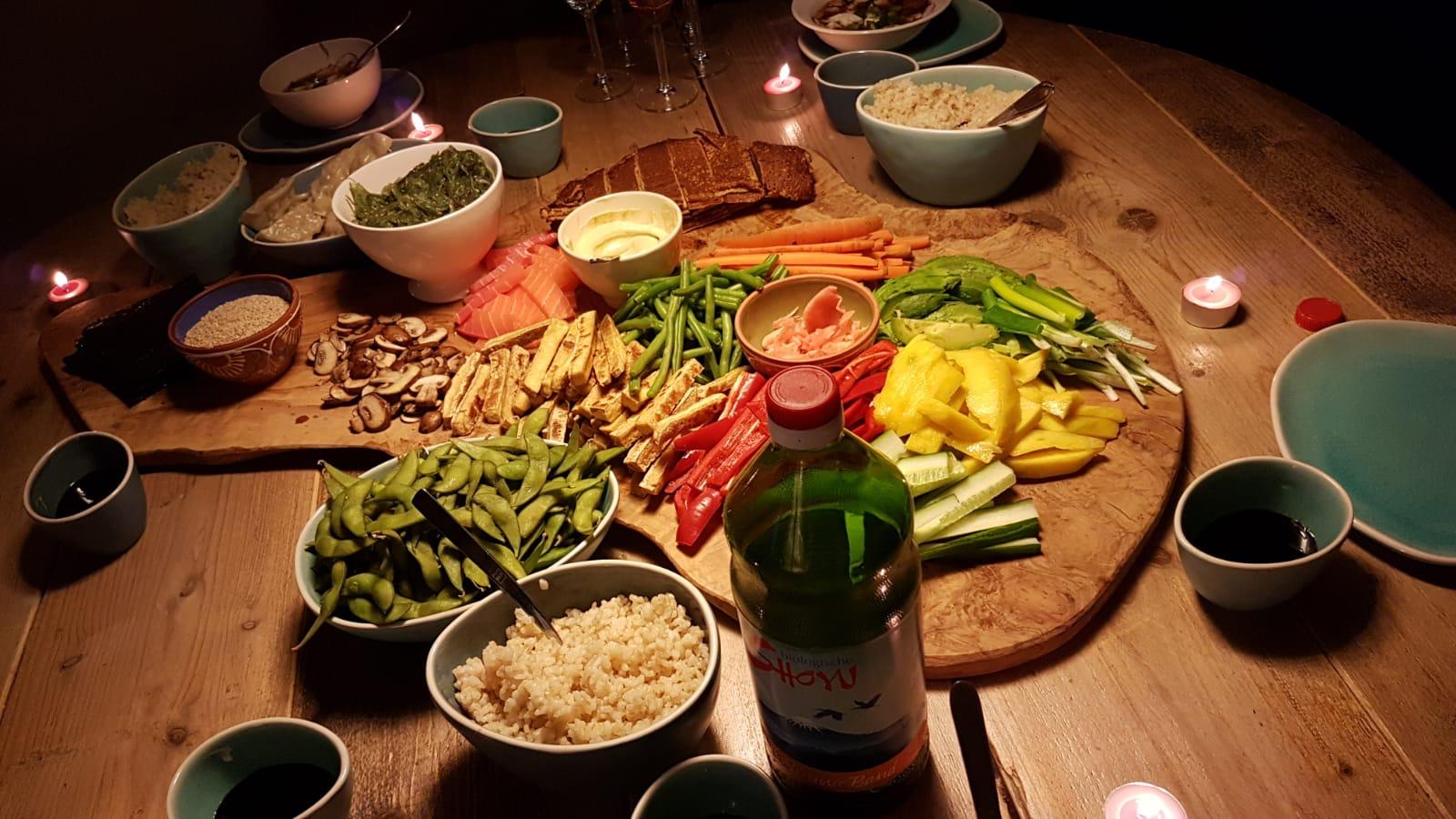 Stond de tafel helemaal vol met allerlei ingrediƫnten en rijst en kleine norivelletjes en dan maakte je gewoon steeds kleine sushi hapjes.