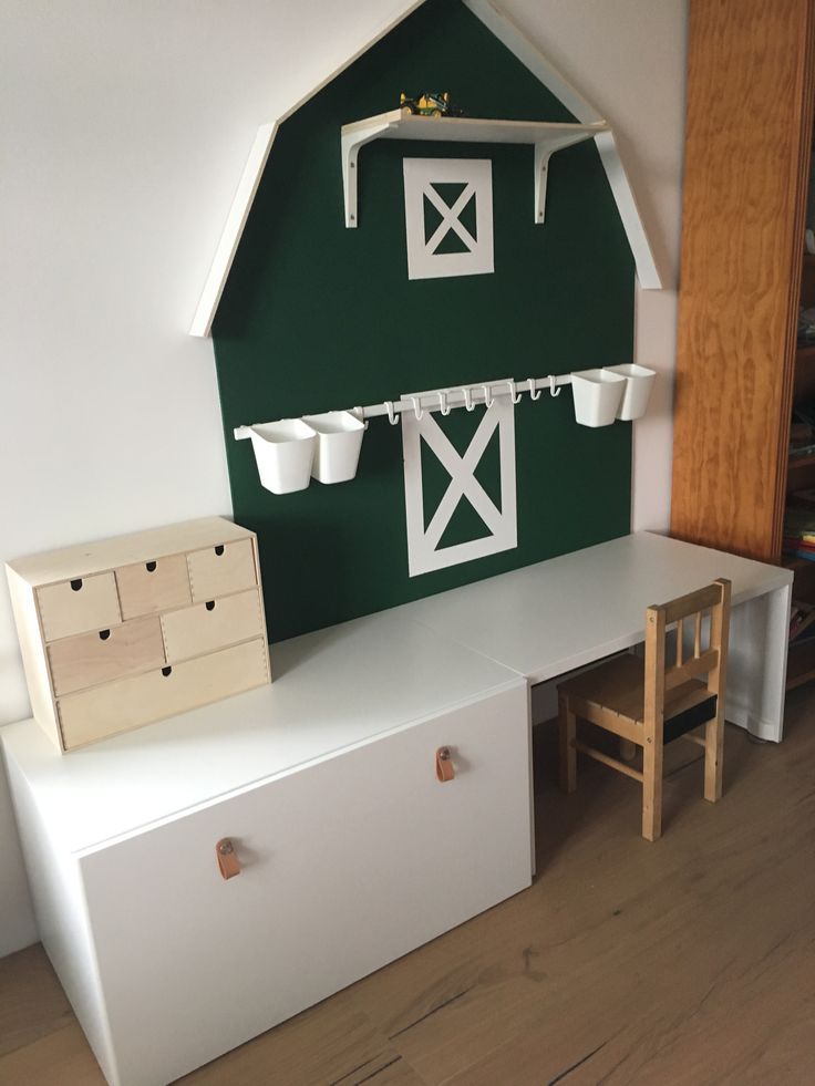 Mijn vriendin heeft om een paar kindermeubels een “huisje” gemaakt als achterwand. Dat maakt het meer een geheel en staat heel leuk.