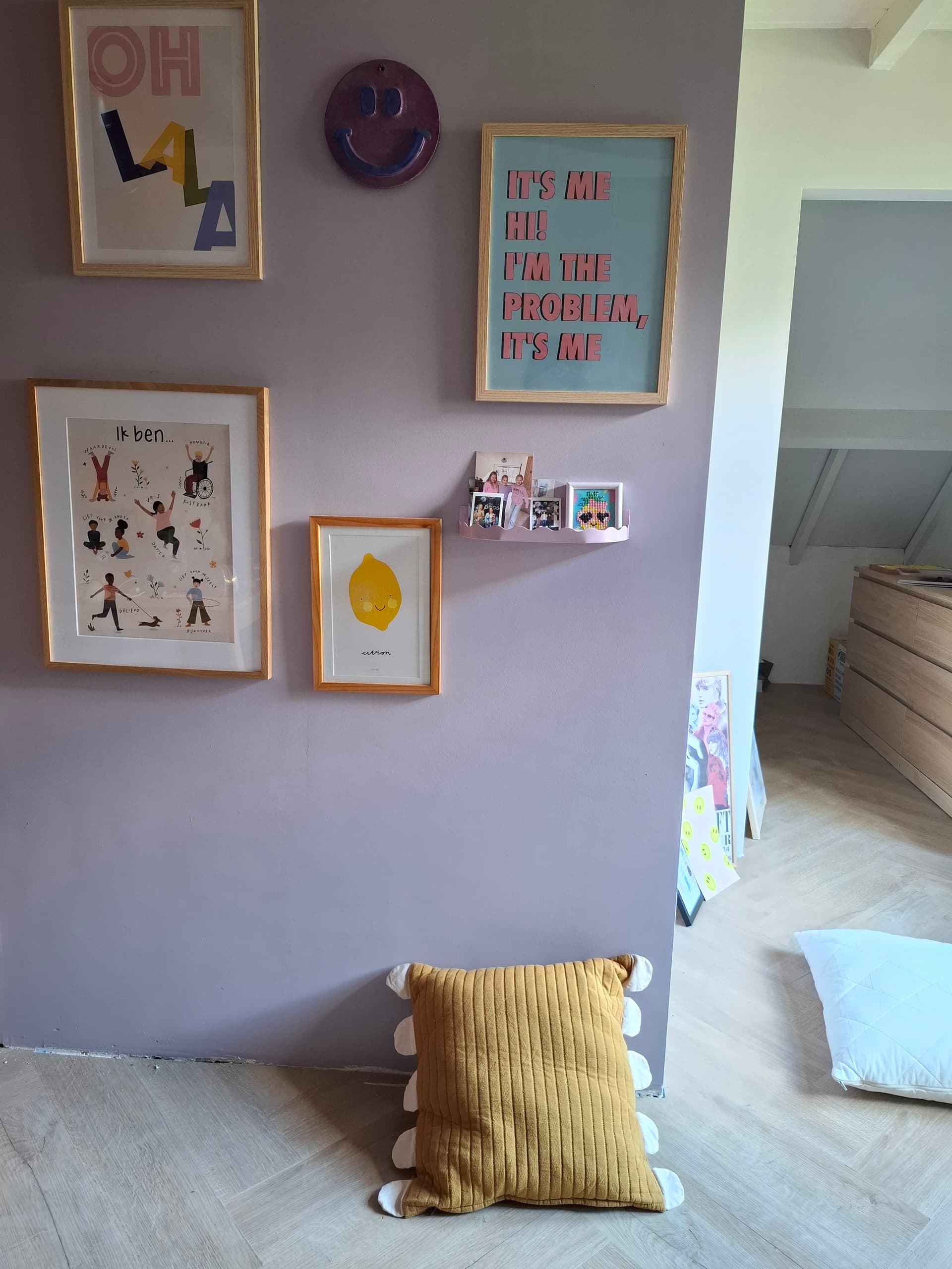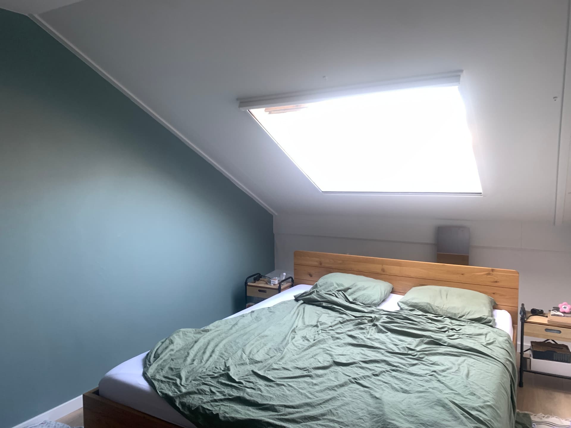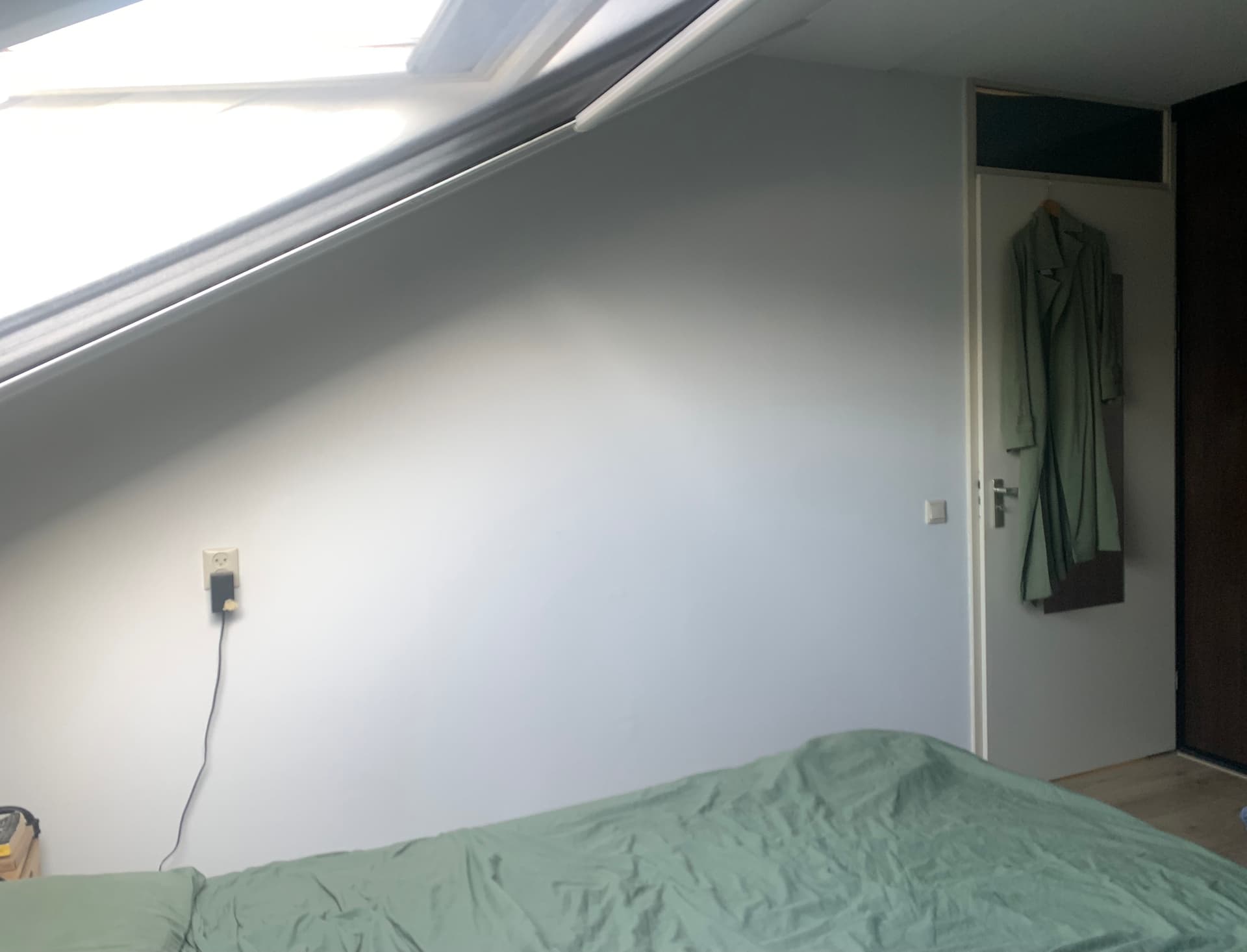 Kan je bed tegen de blauwe wand? Het voelt nu op de een of andere manier krap omdat het plafond zo dicht boven je het hoofd van het bed zit. Verder zou ik investeren in wat dingen die het een knusser gevoel geven want dat kan deze kamer denk ik wel zijn! Extra kussens (2 voor achter je hoofdkussen en 2 kleine of 1 grote ervoor), een lekkere plaid, een fijn kleed. Wat grotere nachtkastjes als dat kan die je troepjes wat meer uit het zicht houden en wat meer body geven aan de kamer. En dan bv een plank de breedte van je bed met boeken en planten, of juist een mooi wandkleed.