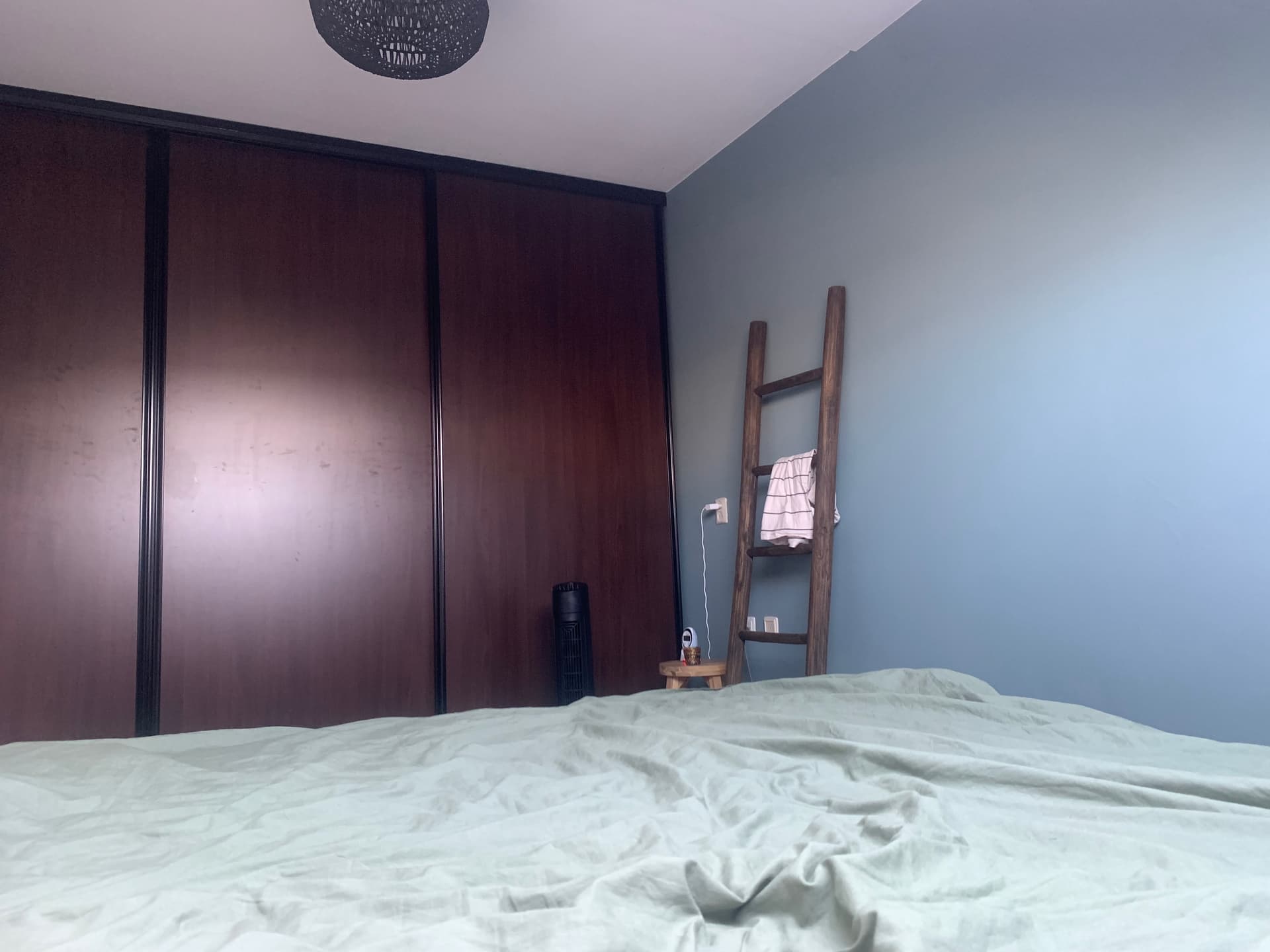 Hebben jullie tips voor onze slaapkamer? Ik vind hem nu zo saai! Op een van de muren zit de kleur Oval Room Blue van Farrow &Ball. Wat ik een erg mooie kleur vindt, maar het steekt nogal af tegen de rest van de muren en plafond (wit) en is eerder koel dan warm. De kleur van de kast is donkerbruin, komt misschien niet goed uit op de foto.