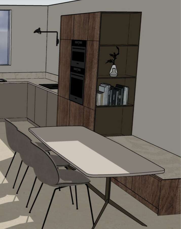 Vanwege het licht en de cv-ketel wil ik geen hoge kasten aan die rechterwand, omdat ik het zo open mogelijk wil houden. Daarom heb ik nu alleen lage kasten ingetekend, maar mijn “probleem” is dat ik het heel lelijk vindt als het dan zo ineens halverwege een muur stopt. Bij een deur of als de muur een hoek om gaat, stoort me dat niet. Ter illustratie: