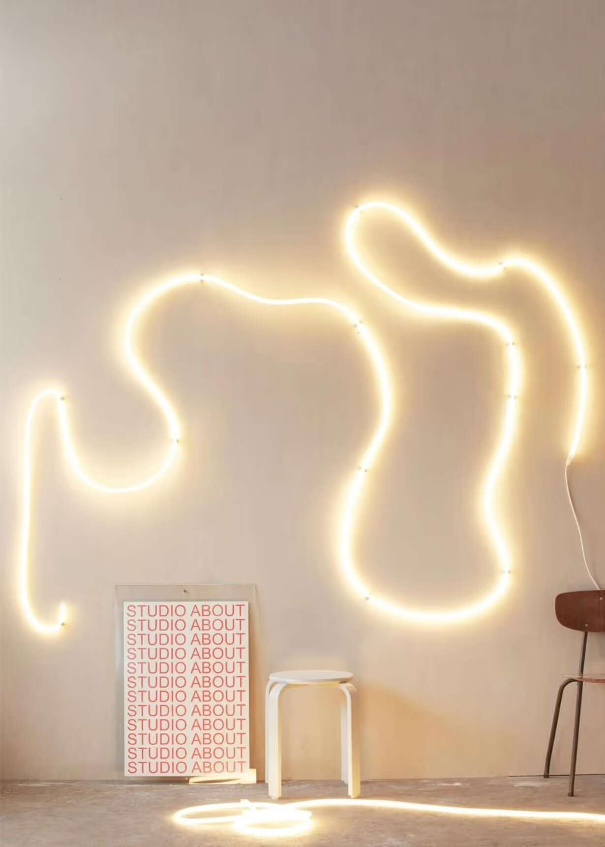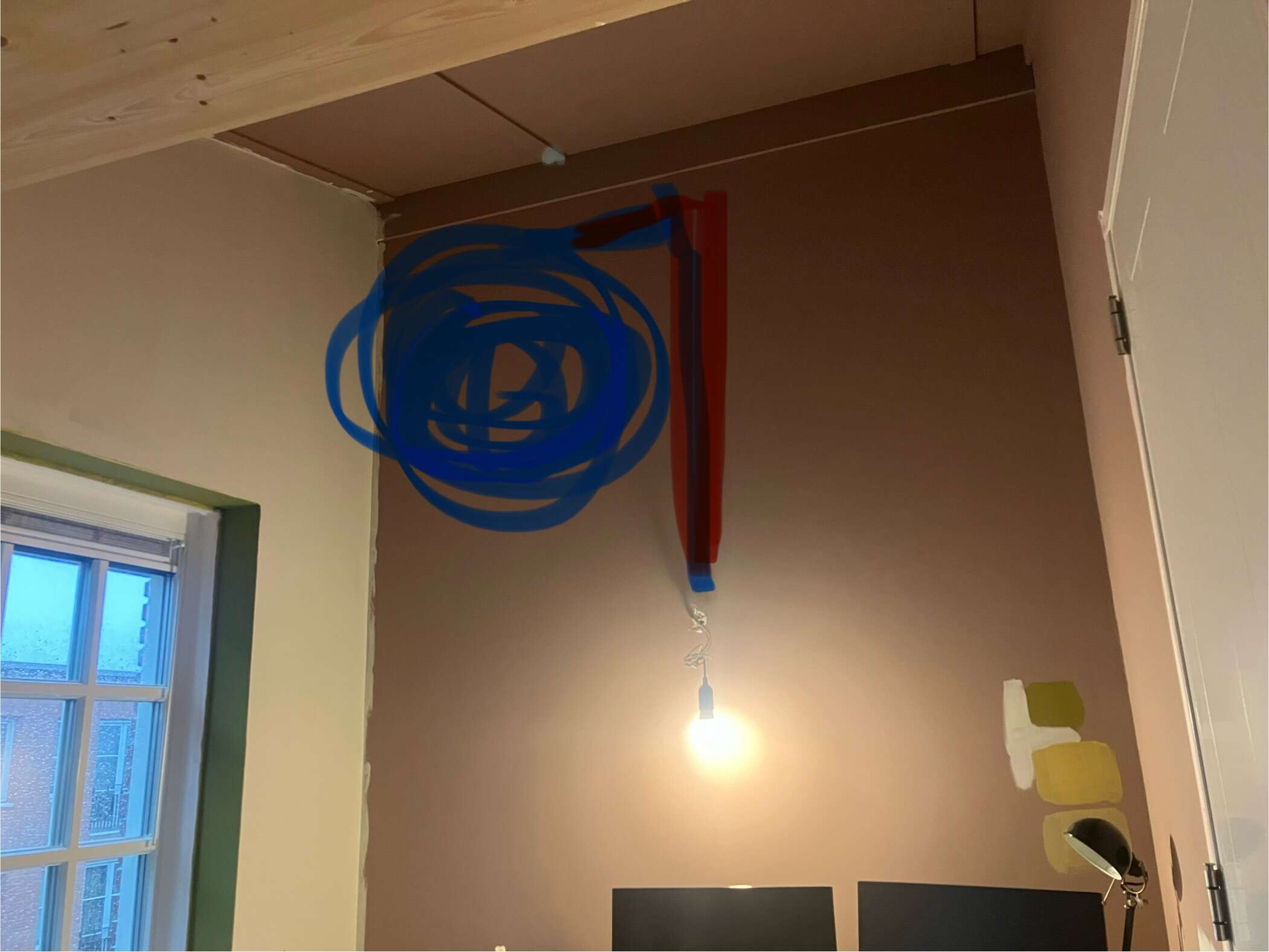 Een snoer kopen die mooi is (textiel in een leuk kleurtje of zo’n gedraaid textiel snoer) en dan met kabelgeleiders werken? 1 of 2 in de wand en dan 1 of 2 in het plafond. Hieronder een vreselijk overdreven en lelijk voorbeeld haha maar het gaat even om het idee. Je kan op wand en plafondgeleiders zoeken