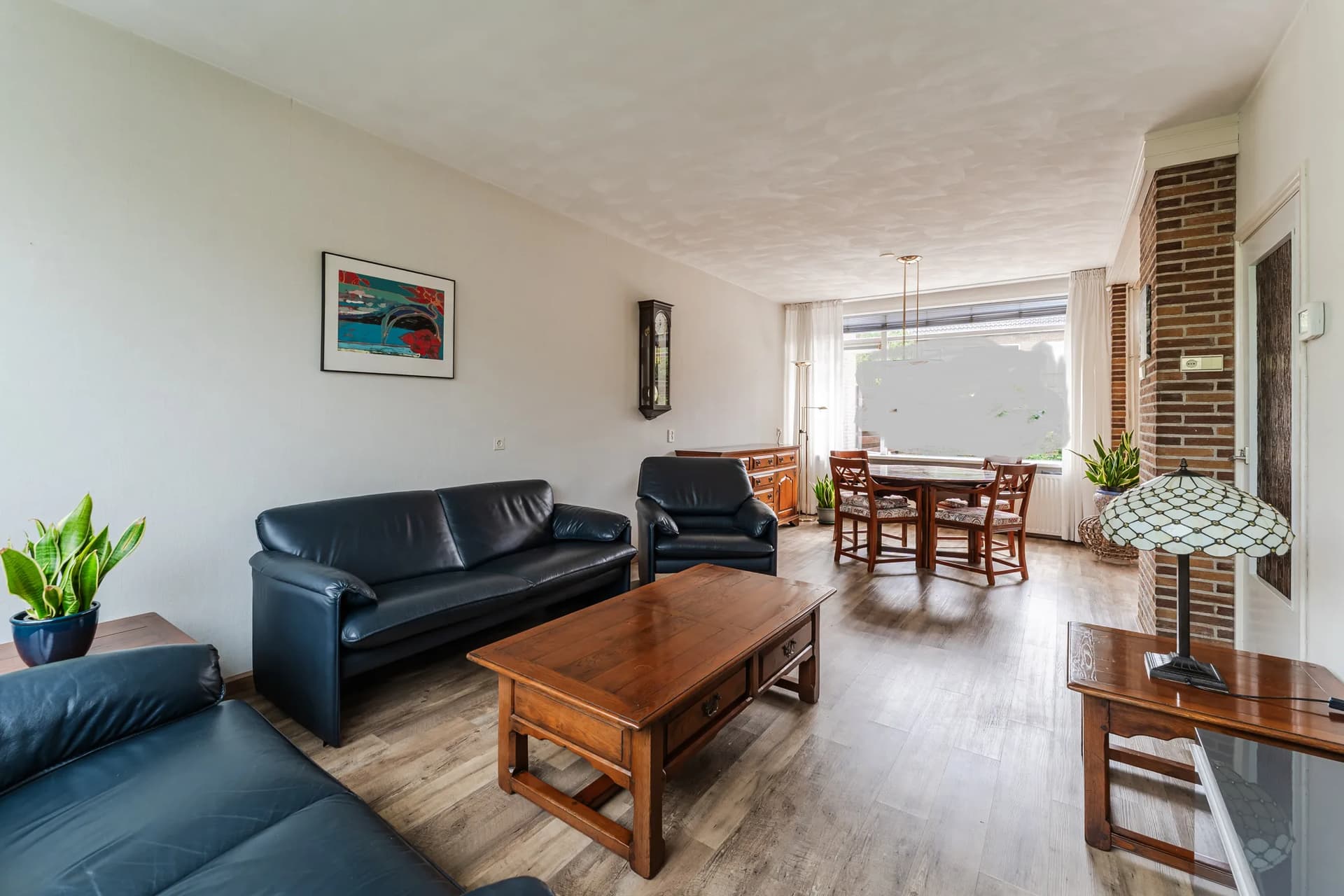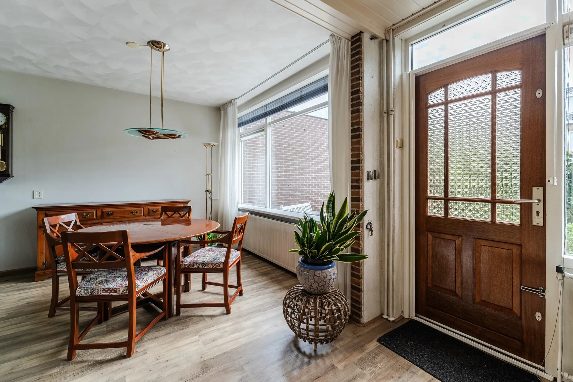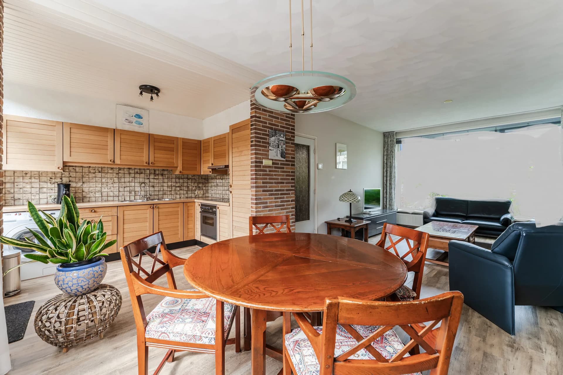 Op de lange wand die de zithoek en de eethoek verbindt, en die tegenover de keuken ligt, willen we graag de groene kleur uit de collages. Voor de tegels in de keuken (tussen werkblad en bovenkastjes) dachten we ook aan groen, maar dat is too much denk ik. De tegels moeten tijdlozer zijn dan de muurkleur wat mij betreft, omdat die het langste meegaan. Wat zouden jullie daar voor kleur kiezen? De bakstenen en de houten deur naar buiten blijven zoals ze zijn.