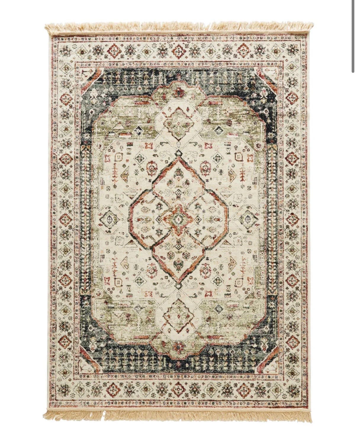 Ik zou zoeken naar kussens die rood/oranje kleur uit het kleed (mooi trouwens!) ophalen. En misschien combineren met een beige/camel kleur?