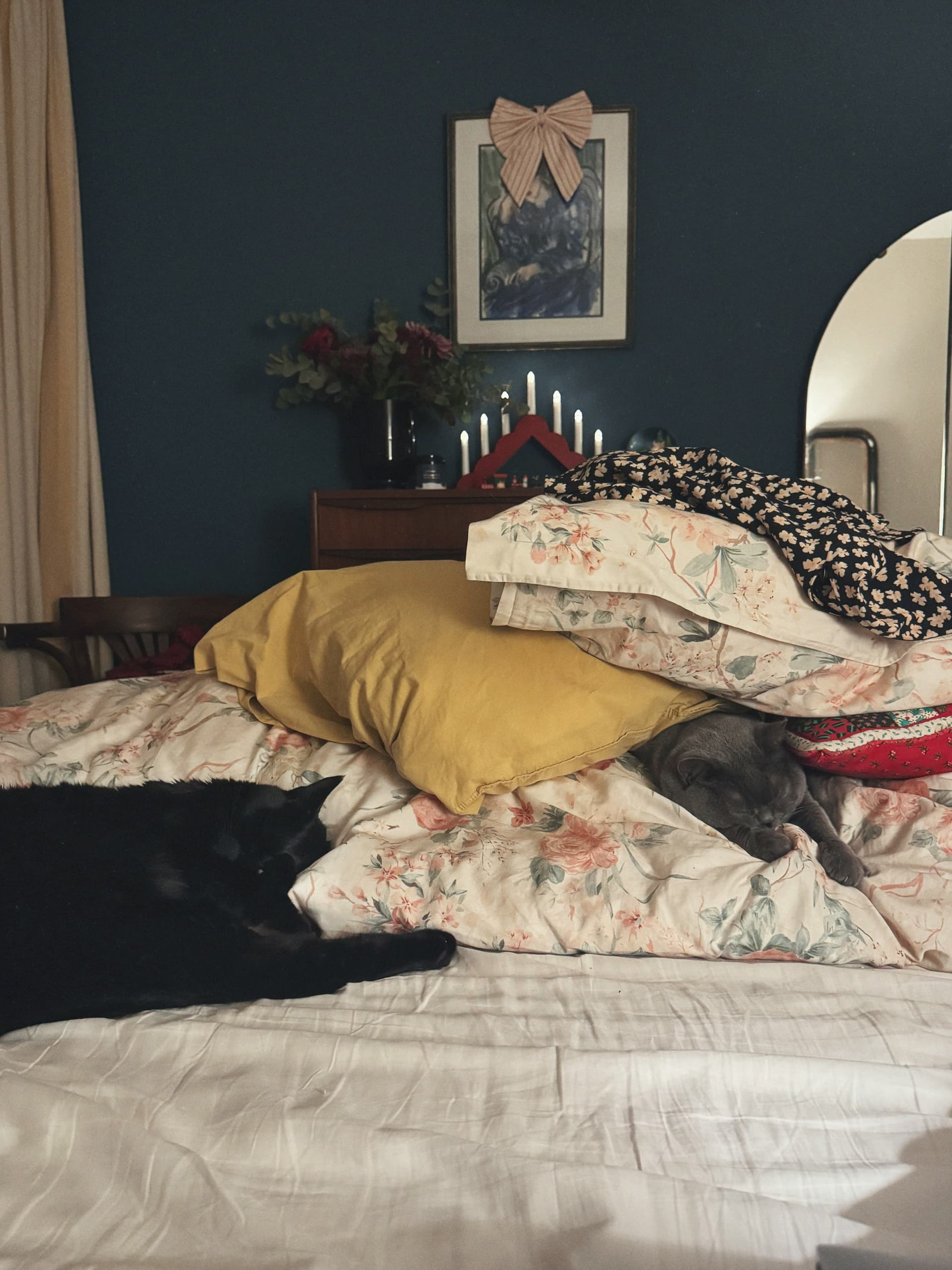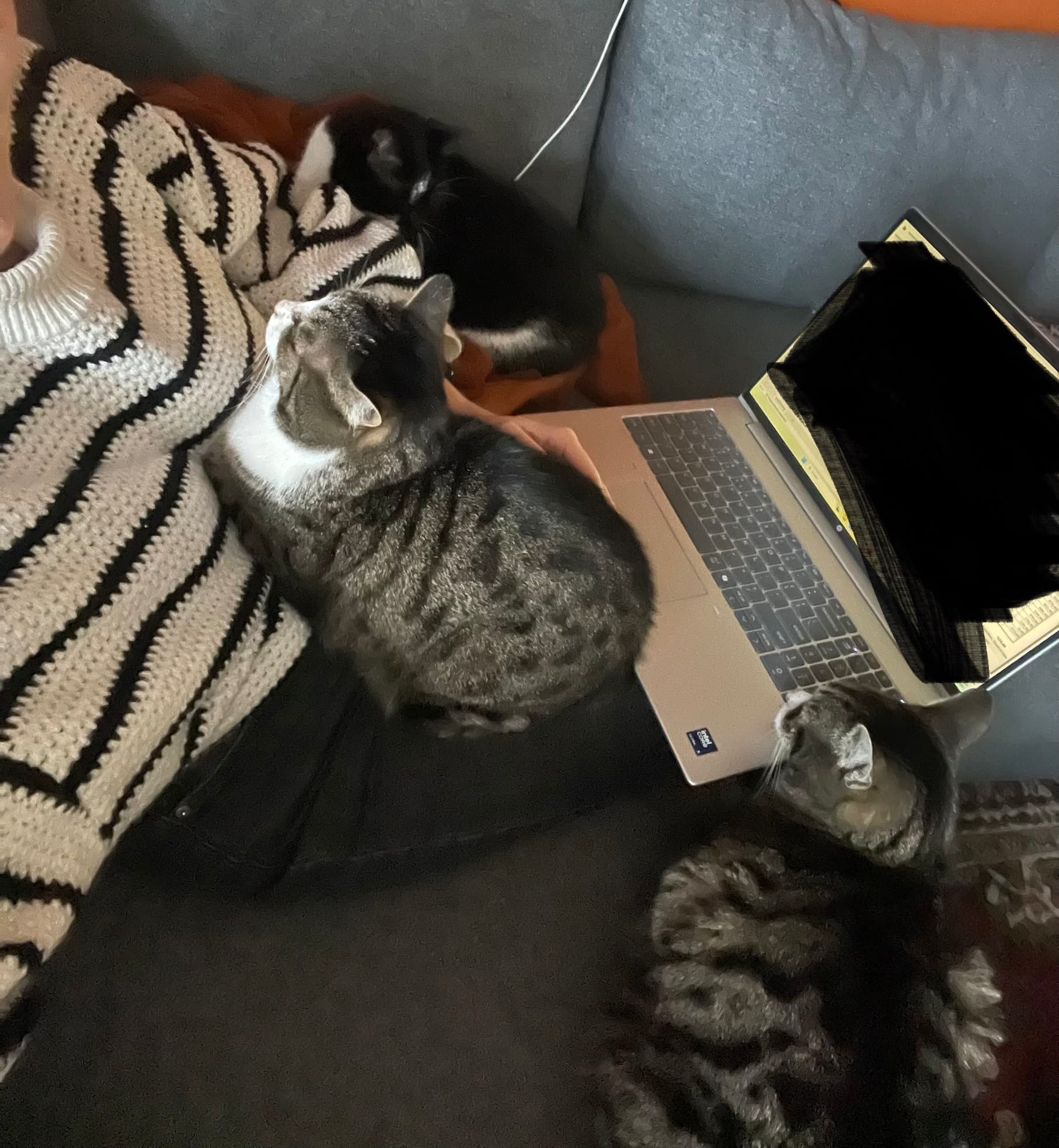 Een van onze drie katten die normaal nooit op schoot lag (alleen in bed kwam hij op ons liggen), is sinds een week ofzo niet weg te slaan van (met name mijn) schoot. Super lief, geniet er ook helemaal van, maar er zit nu dus de hele tijd nóg een kat in mijn aura