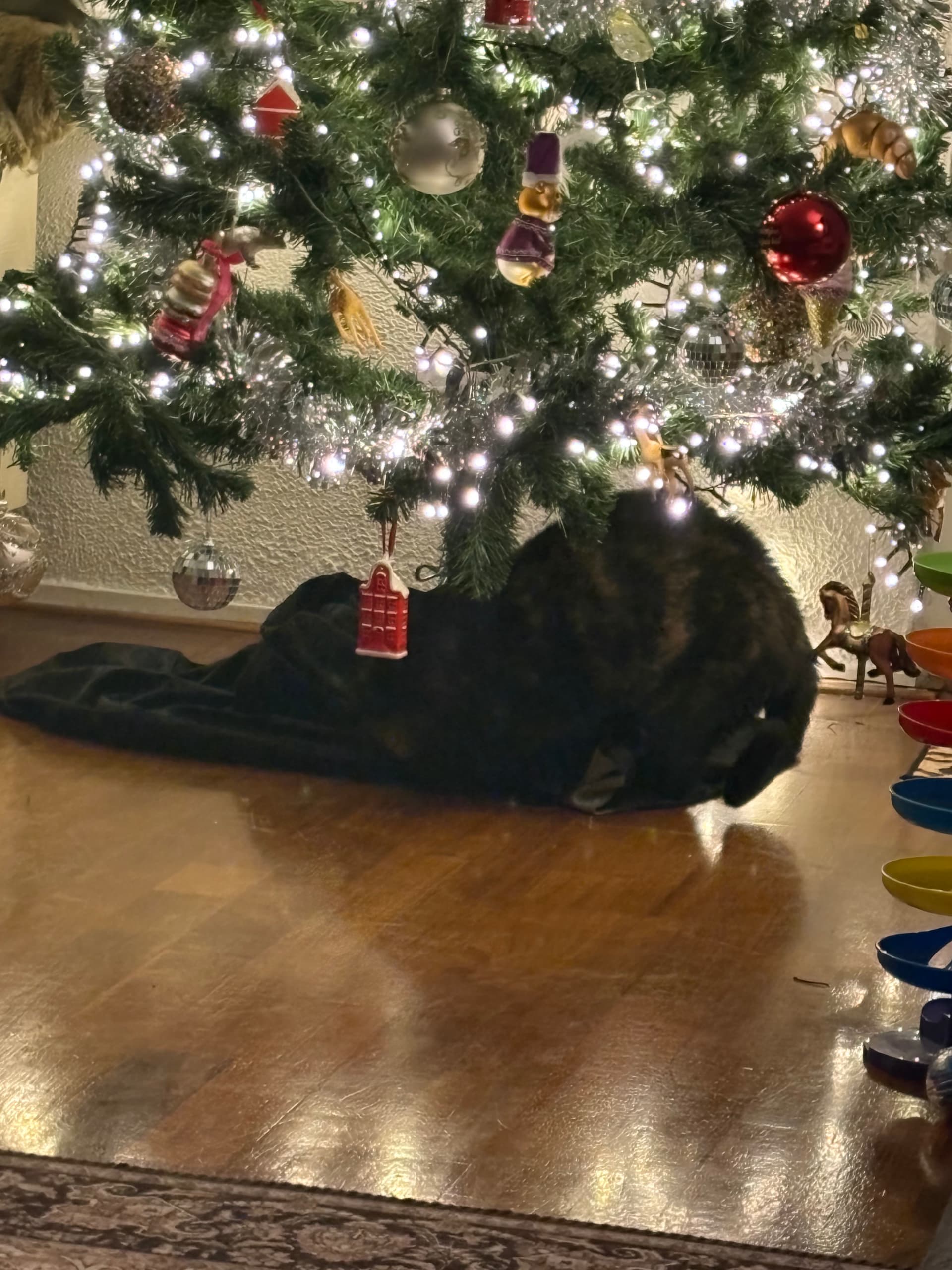 Ik dacht al dat mn poes zat te kutten met de rok van de kerstboom maar nu heb ik haar betrapt