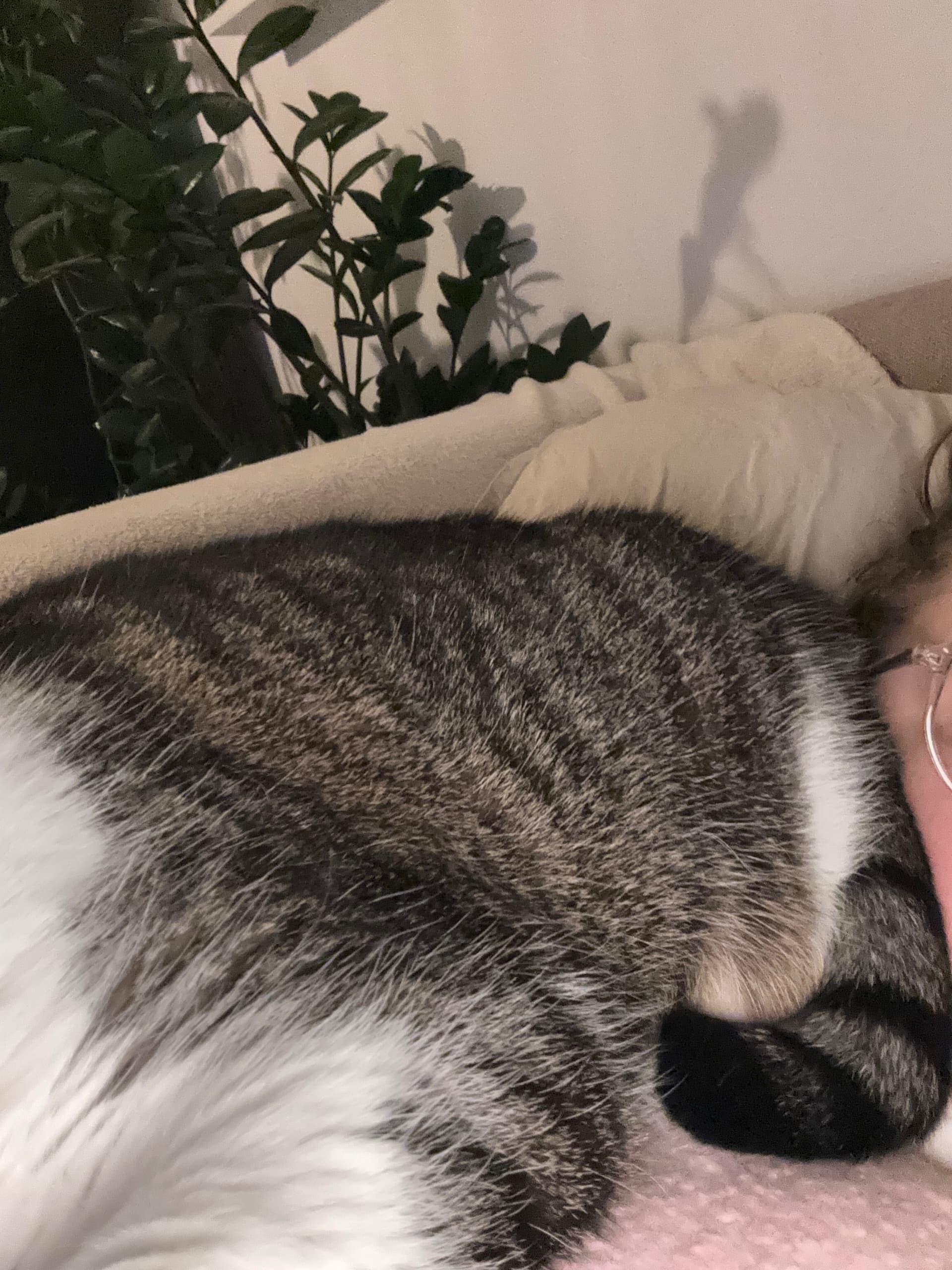 Mijn katten zijn altijd al twee magneten geweest, maar de ene had altijd een heel specifieke voorkeur voor rechts van mij liggen. Echt tegen me aan geplakt wel dus ik moest mijn positie goed kiezen want zodra hij ging liggen kon ik niet meer bewegen. Soms wilde hij dan even een minuutje in mijn armen liggen maar daarna weer terug naar de positie rechts naast me.