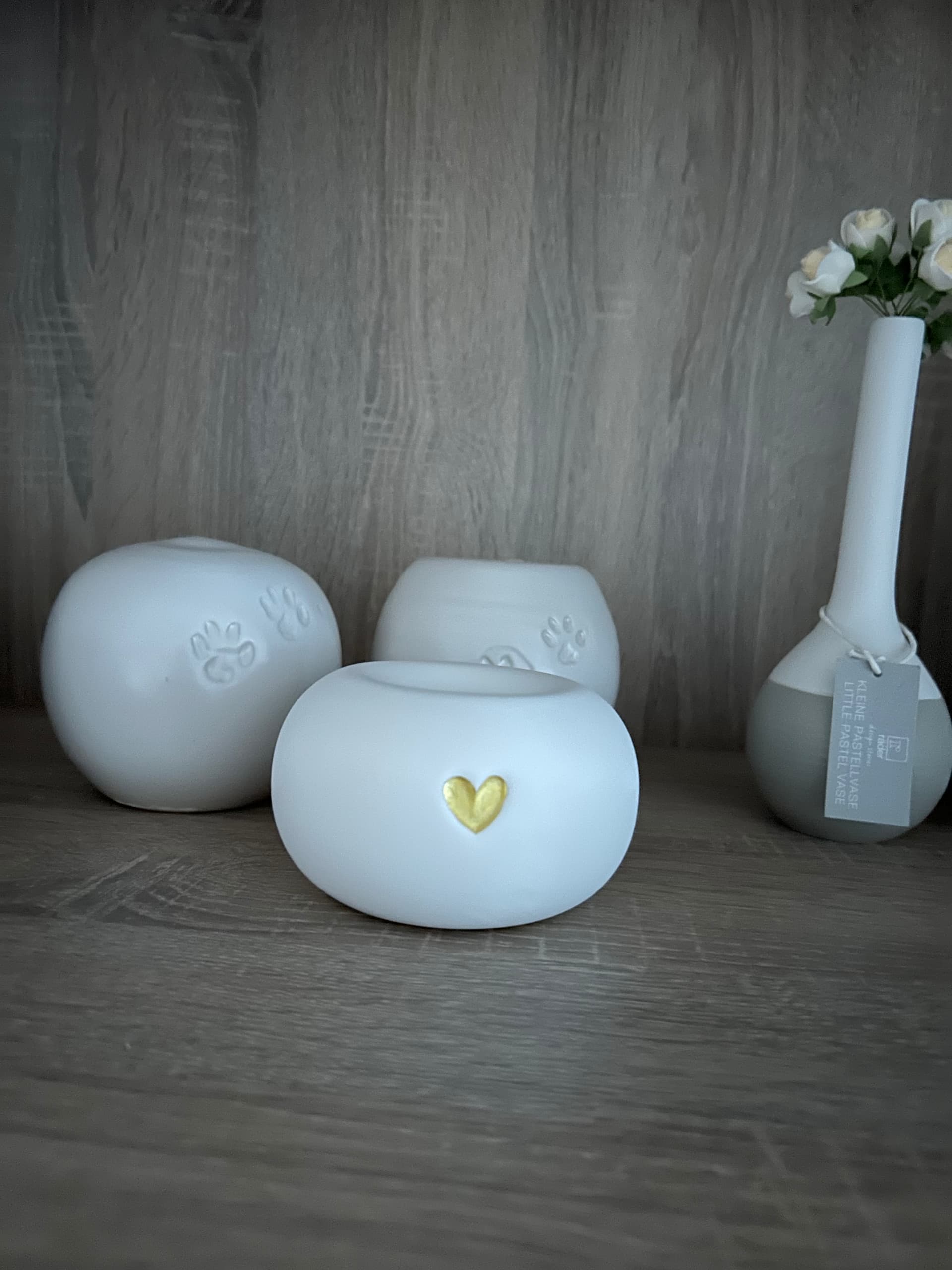 Achteraan staan de urnes van onze overleden hond (2015) en kat (2017). Dat waren urnes van het crematorium en vonden we mooi bij elkaar passen. Toen onze andere kat in januari dit jaar overleed was het een ander crematorium (vorige was gestopt) en vonden we de beschikbare urnes niet zo mooi, dus toen hebben we zelf eentje online besteld. Dat is die met het hartje op de foto.