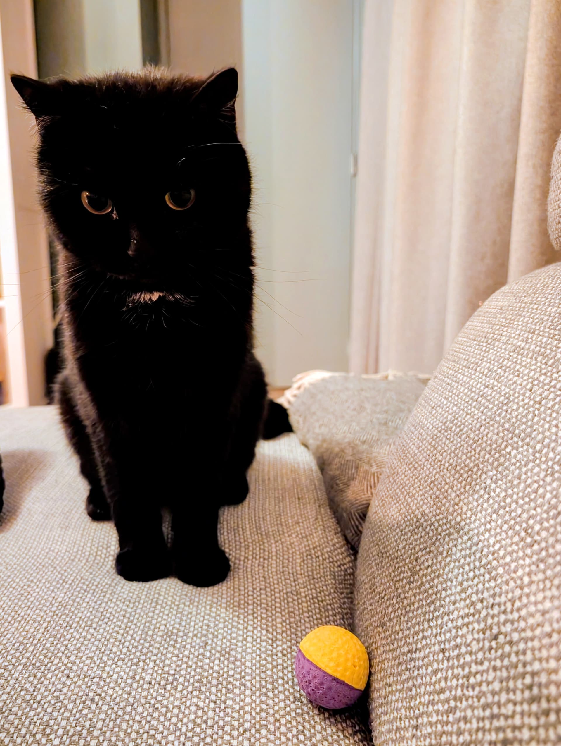 Toevallig ook gék op sperziebonen, als in als hij ze heeft gezien is het klaar en moet hij ze eten. En zijn lievelingsspel is apporteren met een heel klein pluche voetballetje. Kletst ook de oren van je kop en is mega aanhankelijk, maar dat had ik zien aankomen toen ik hoorde dat zijn moeder een siamees gekruist met een sphynx was. Vader één van de normale buurtkatten die er toevallig was toen moeder ontsnapt was.